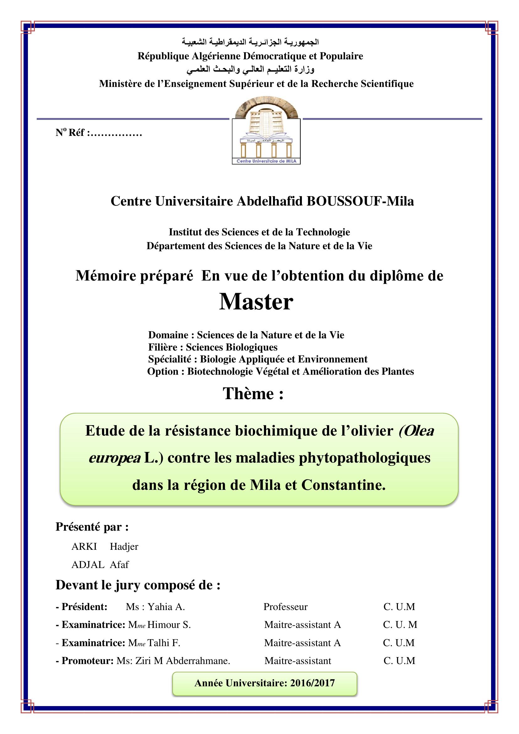 Arki hadjer & Yahia A.Président, H. (2017). Etude de la résistance biochimique de l'olivier (olea europea L.) contre les maladies phytpathologiques dans la région de mila et constantine.