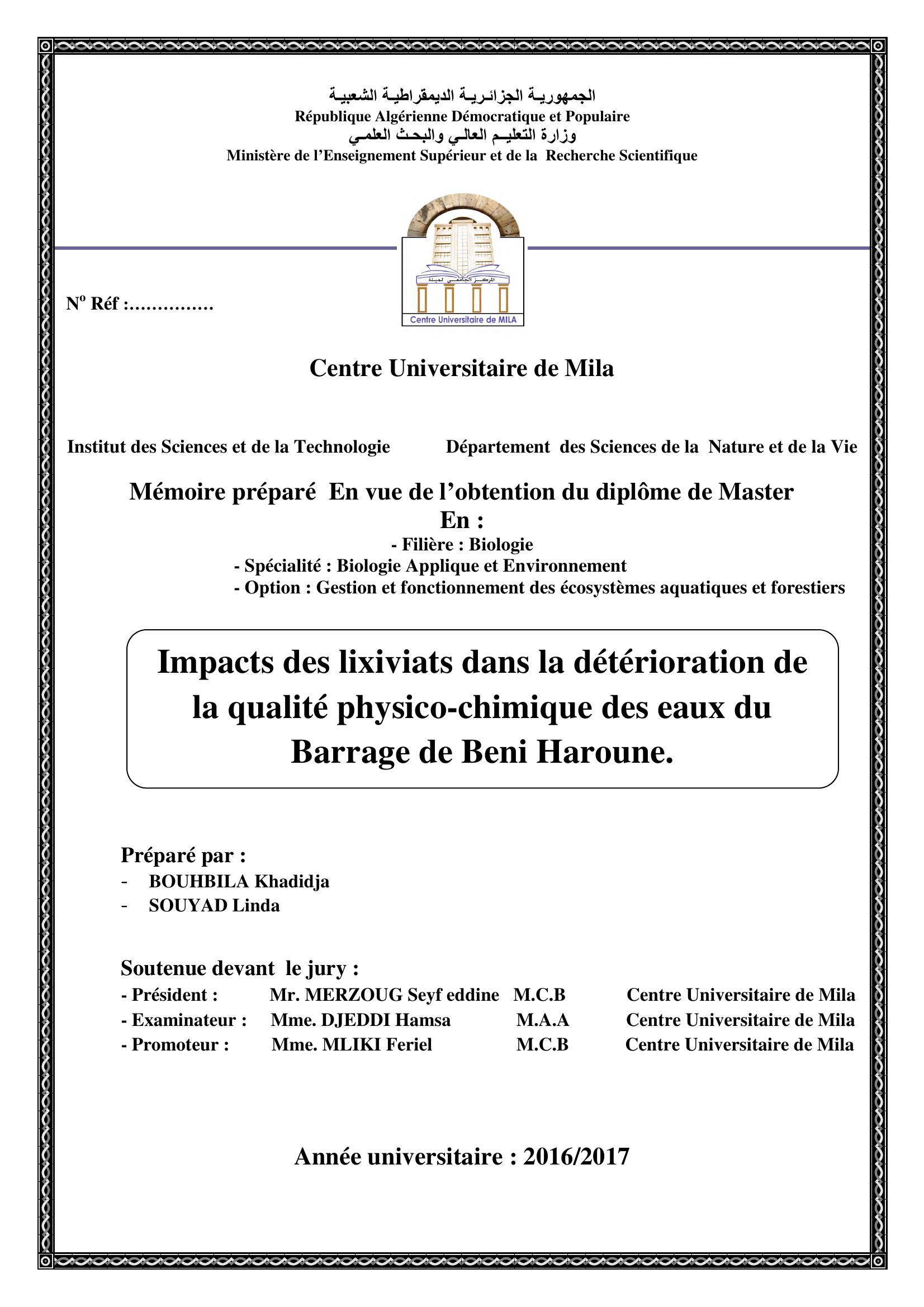 Bouhbila khadidja & MERZOUG Seyf eddine Président, D. (2017). Impacts des lixiviats dans la détérioration de la qualité physico -chimique des eaux du barrage de beni haroune..