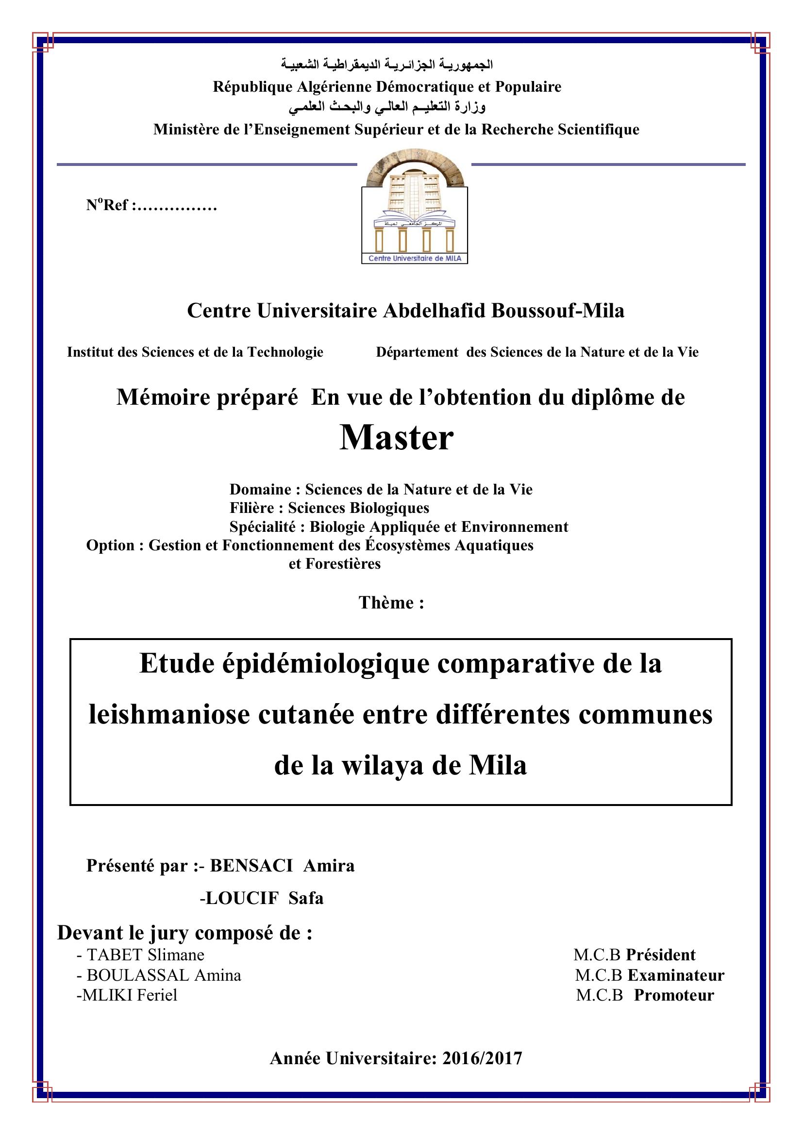 Bensaci amira & TABET Slimane Président, B. (2017). Etude épidémiologique comparative de la leishmaniose cutanée entre différentes communes de la wilaya de mila.