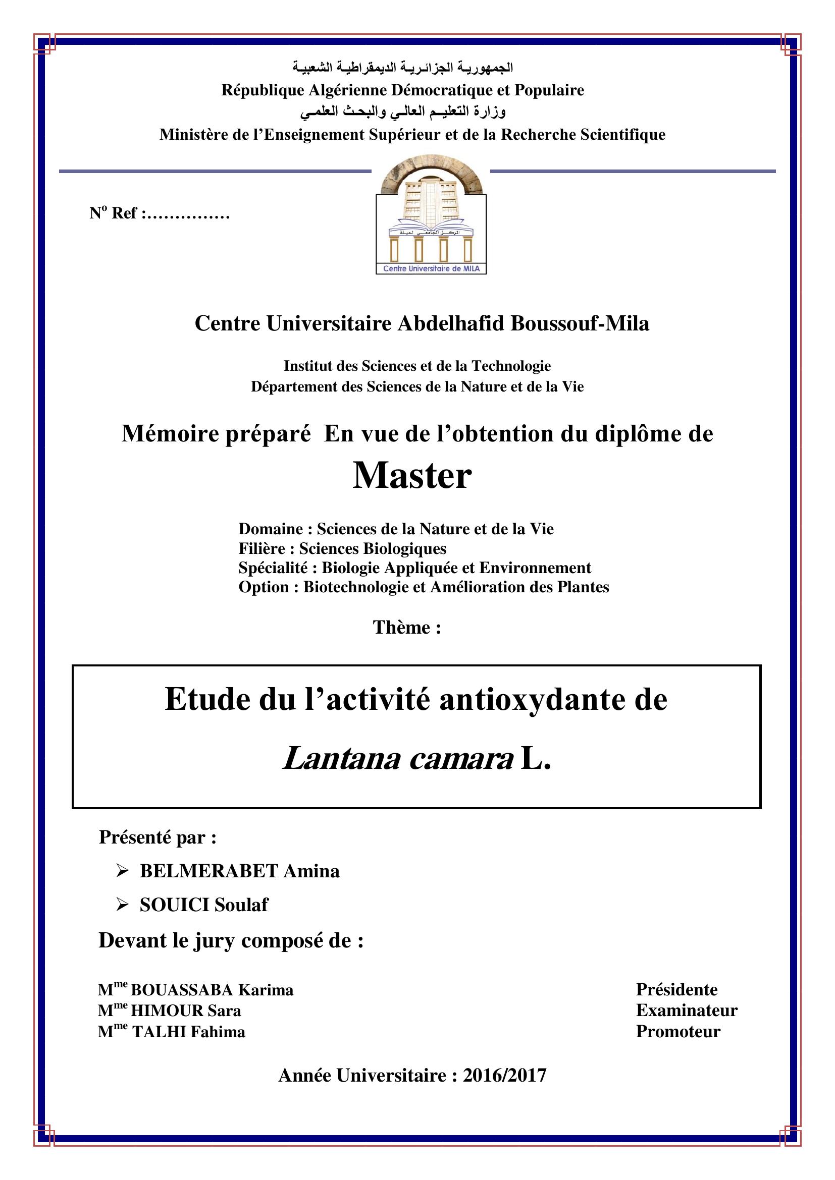 Belmerabet amina & BOUASSABA Karima Présidente, H. (2017). Etude du l'activité antiozydante de lantana camara L..