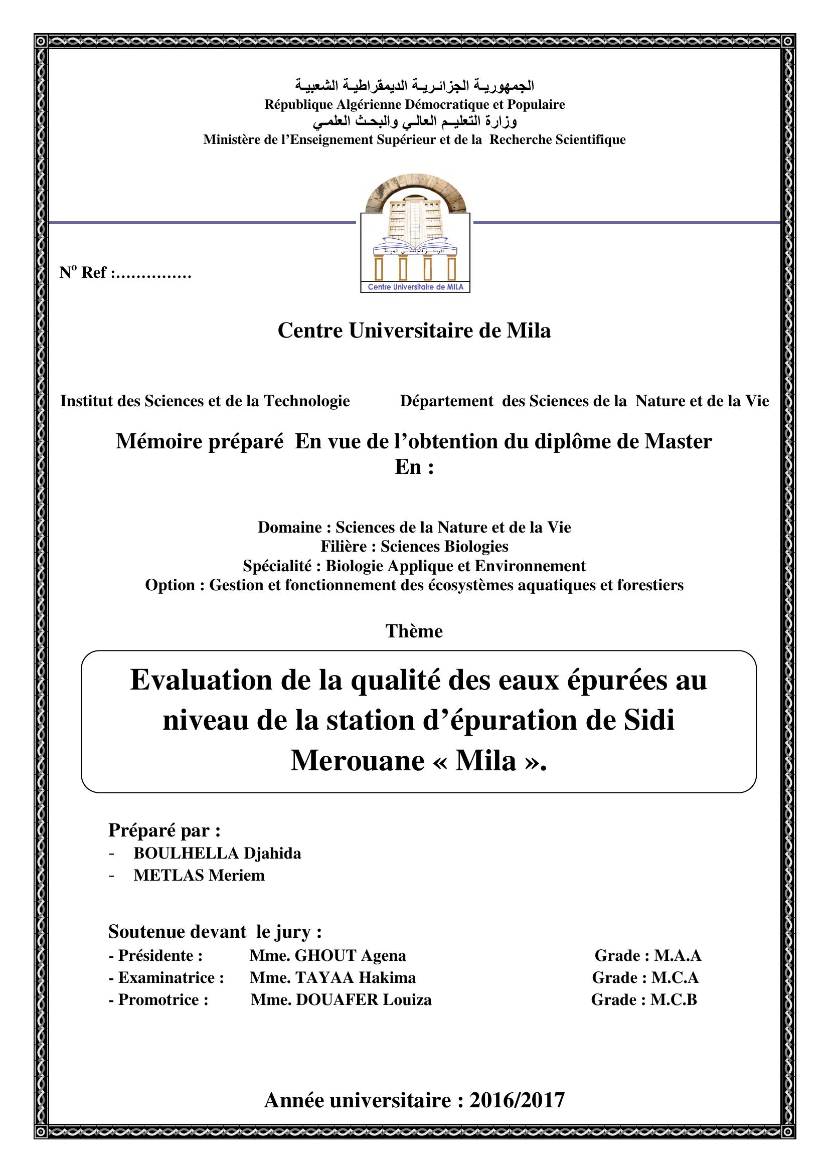 Boulhella djahida & GHOUT Agena Présidente, T. (2017). Evaluation de la qualité des eaux épurées au niveau de la station d'épuration de sidi merouane mila.
