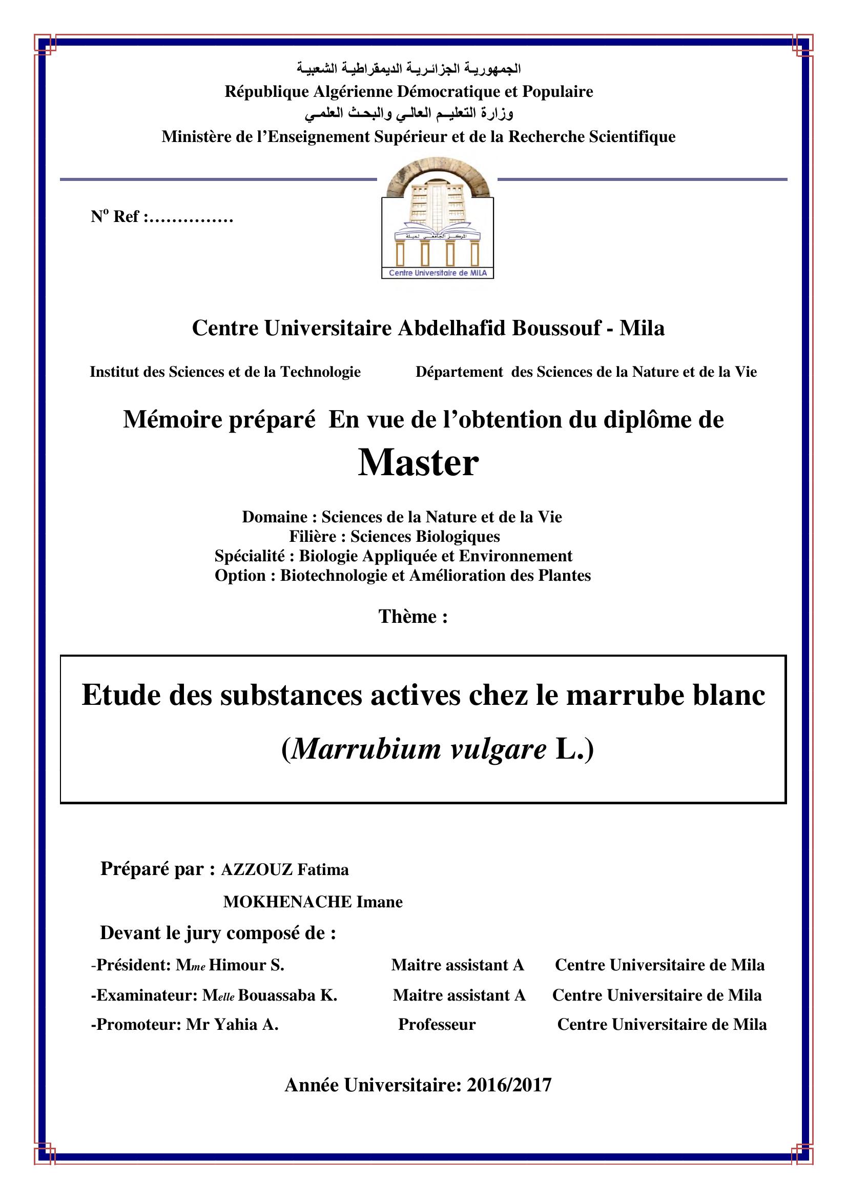Azzouz fatima & Himour S Président, B. (2017). Etude des substances actives chez le marrube blanc ( marrubium vulgare L.).