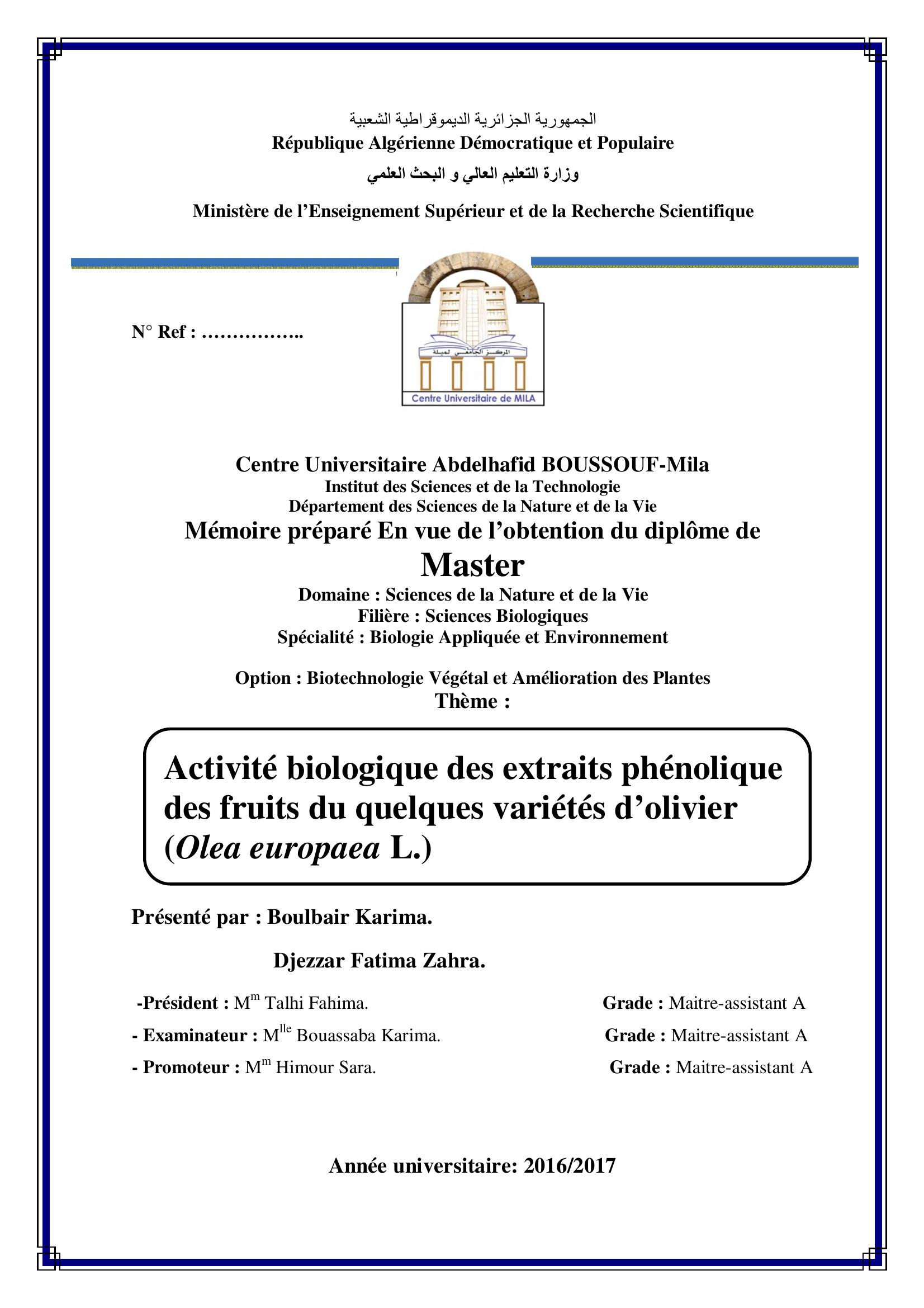 Boulbair karima & Talhi Fahima Président, B. (2017). Activité biologique des extraits phénolique des fruits du quelques variétés d'olivier (OLEA europaea L.).