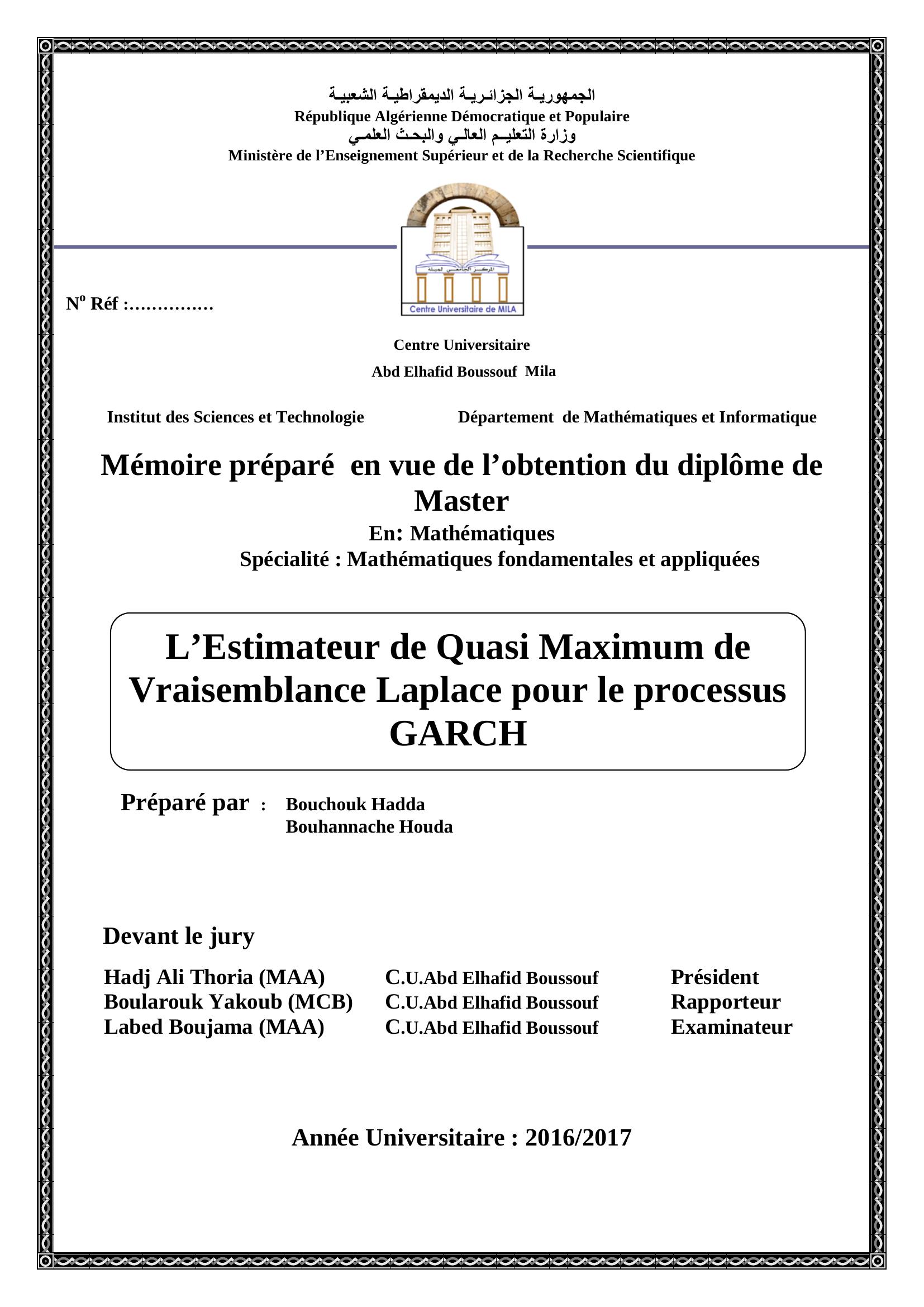 Bouchouk Hadda & Hadj Ali Thoria Président, B. (2017). L 'estimateur de quasi maximum de vraisemblance laplace pour le processus grach.