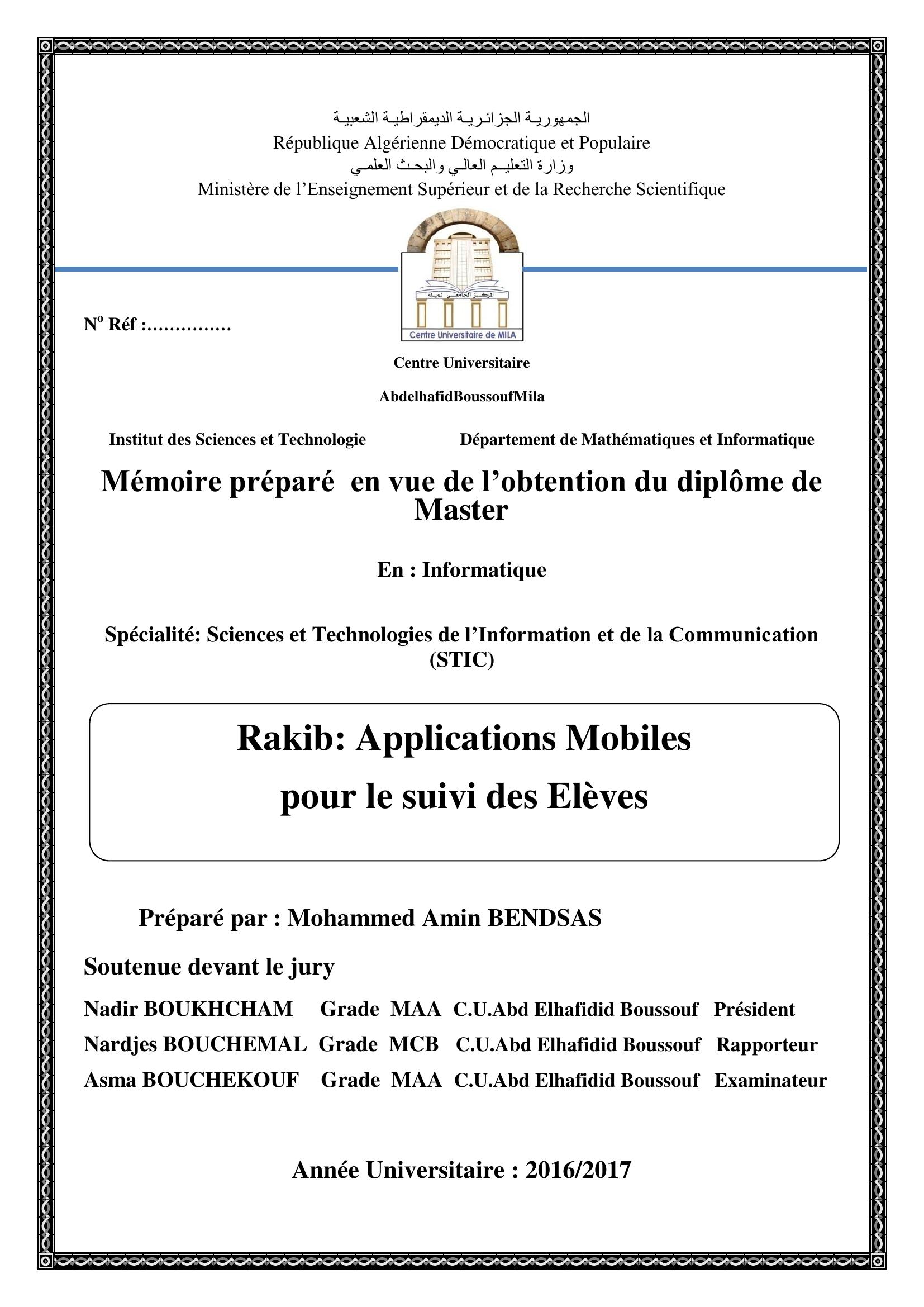 Bendas Mohamed Amin & Nadir BOUKHCHAM Président, N. (2017). Rakib : applications mobiles pour le suivi des eléves.