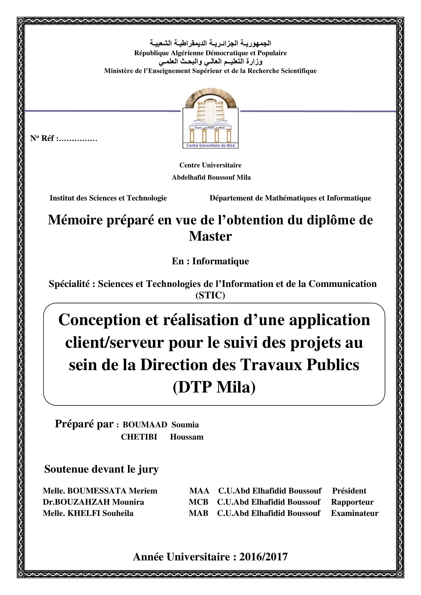 Boumaad Soumia & BOUMESSATA Meriem Président, B. (2017). Conception et réalisation d'une application client /serveur pour le suivi des projets au sein de la direction des travaux publics (DTP mila.