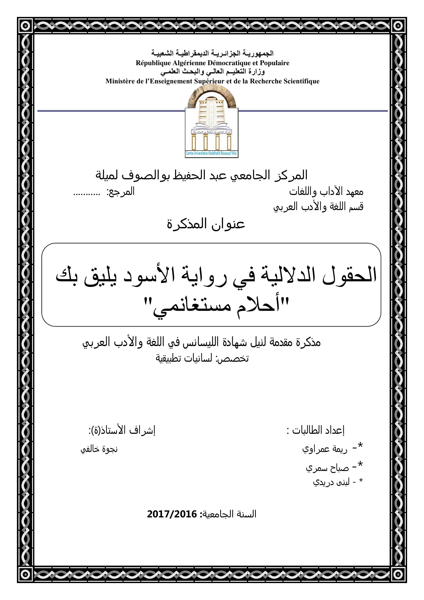 عمراوي ريمة et al. (2017). الحقول الدلالية في رواية الأسود يليق بك '' أحلام مستغانمي ''.