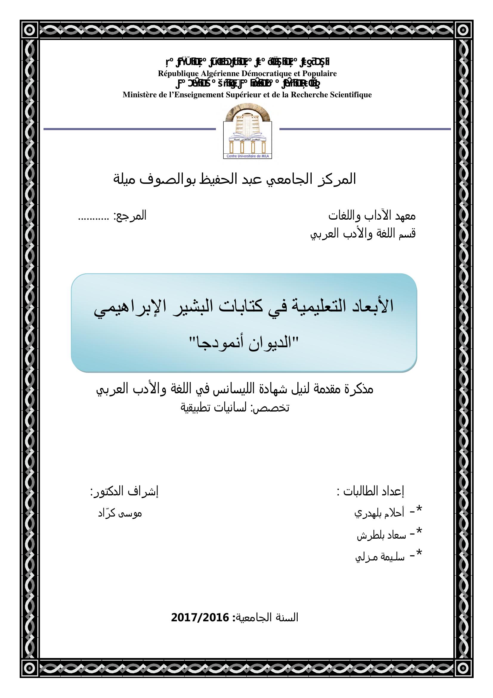 بلهدري أحلام et al. (2017). الأبعاد التعليمية في كتابات البشير الإبراهيمي '' الديوان أنموذجا''.