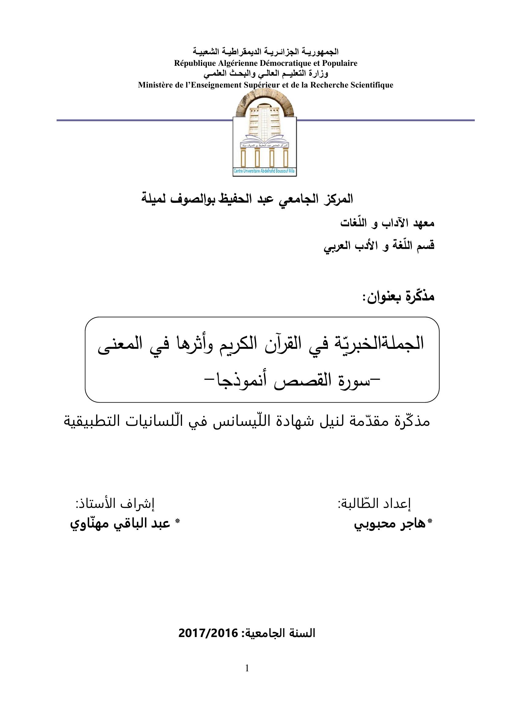 محبوبي هاجر & مهناوي عبد الباقي(مشرفا) (2017). الجملة الخبرية في القرآن الكريم وأثرها في المعنى سورة القصص أنموذجا.