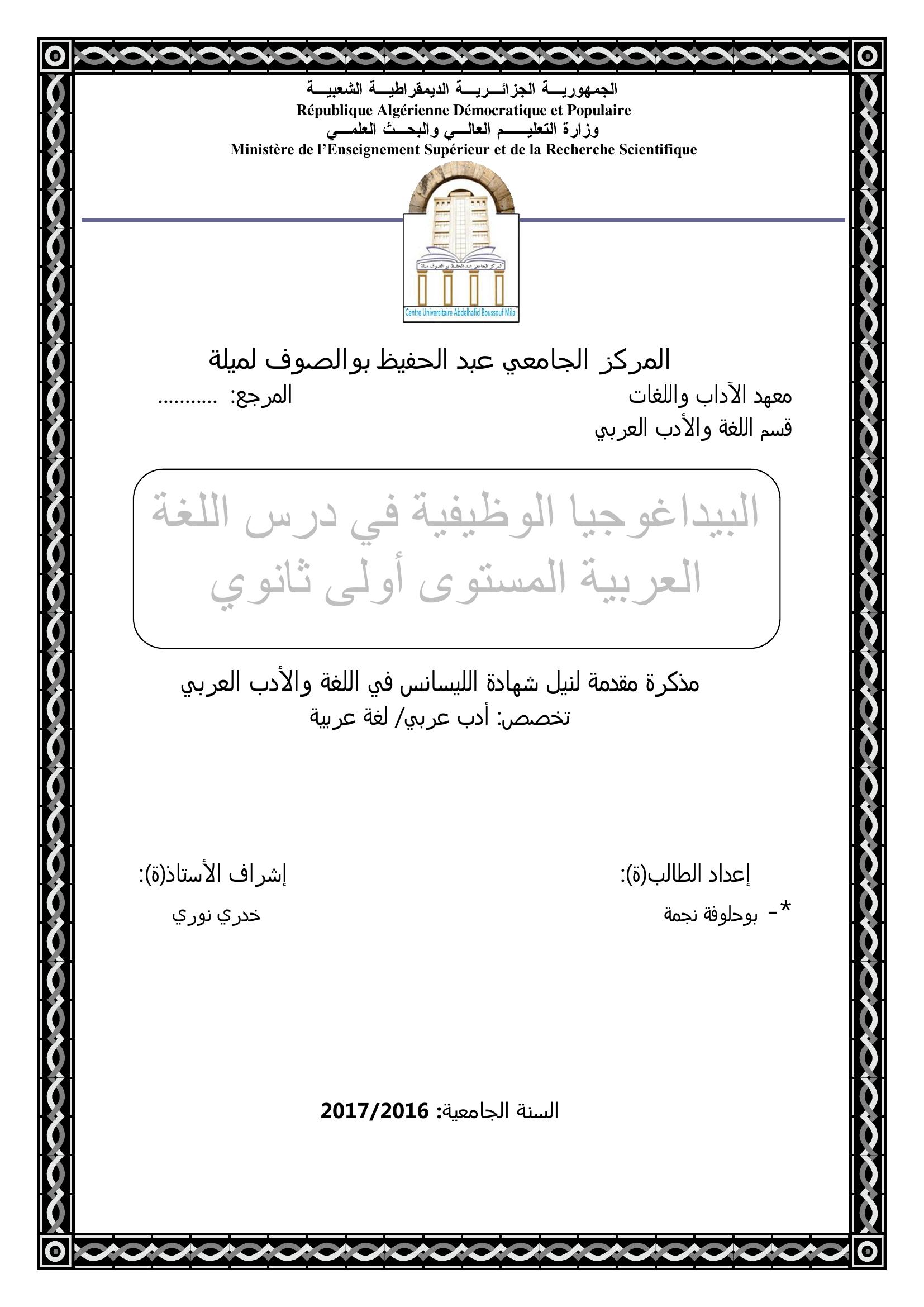 بوحلوفة نجمة & خذري نوري (مشرفا) (2017). البيداغوجيا الوظيفية في درس اللغة العربية المستوى الأولى ثانوي.