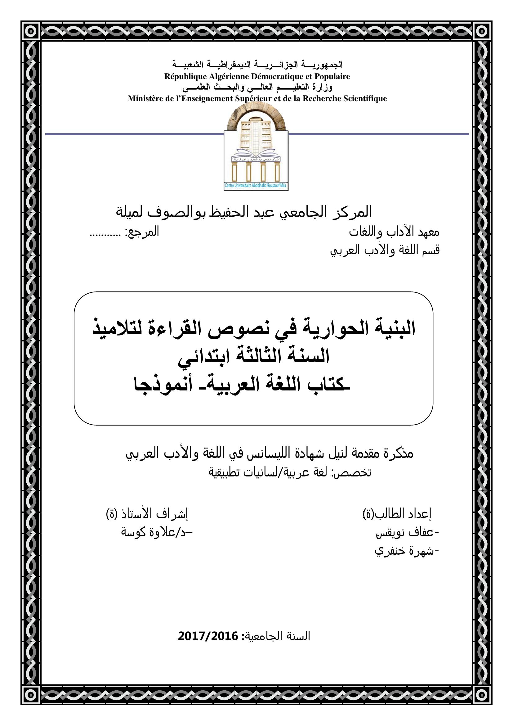نويقس عفاف et al. (2017). البنية الحوارية في نصوص القراءة الموجهة لتلاميذ السنة الثالثة إبتدائي كتاب اللغة العربية أنموذجا.