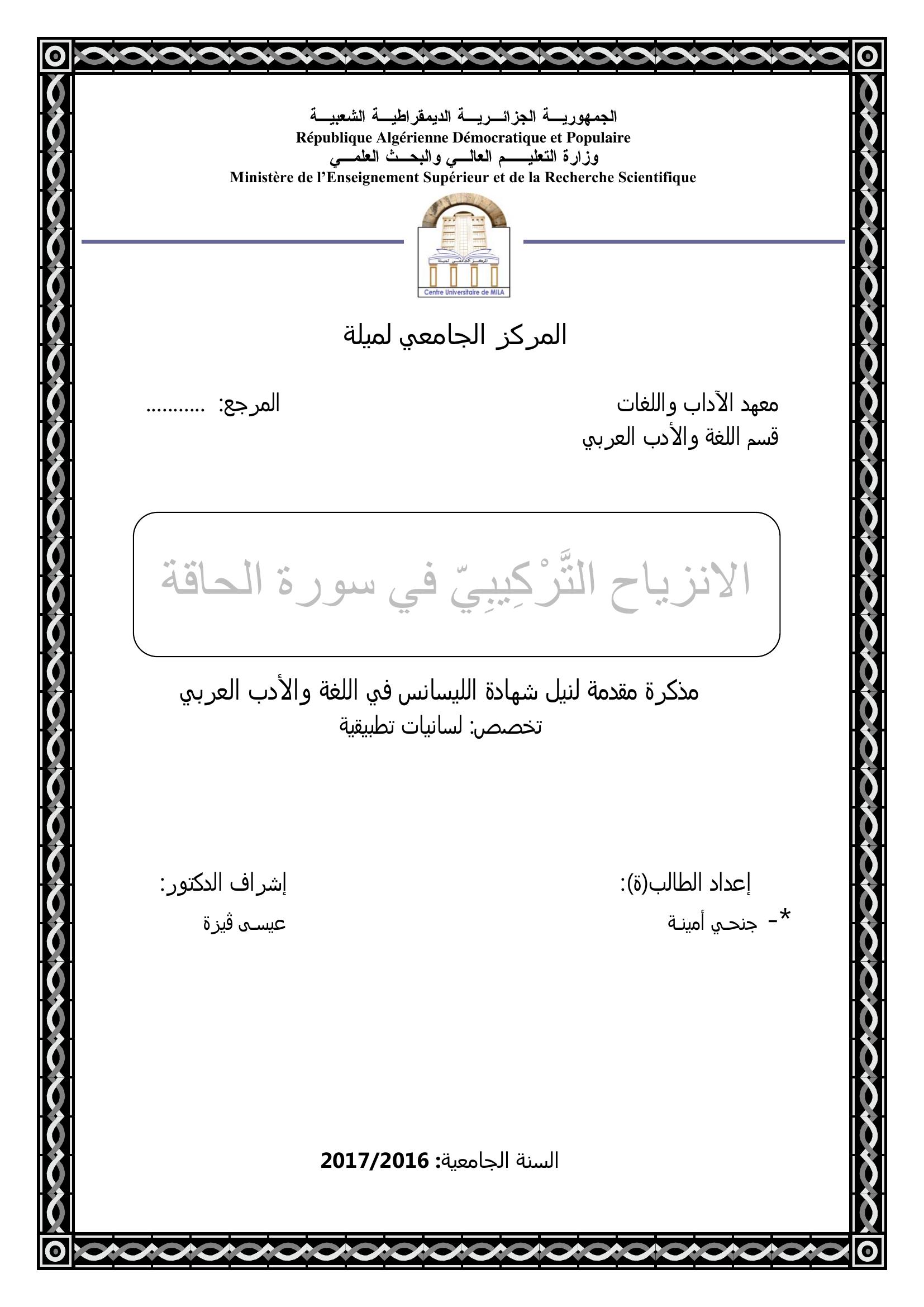 جنحي أمينة & قيزة عيسى ( مشرفا) (2017). الإنزياح التركيبي في سورة الحاقة.