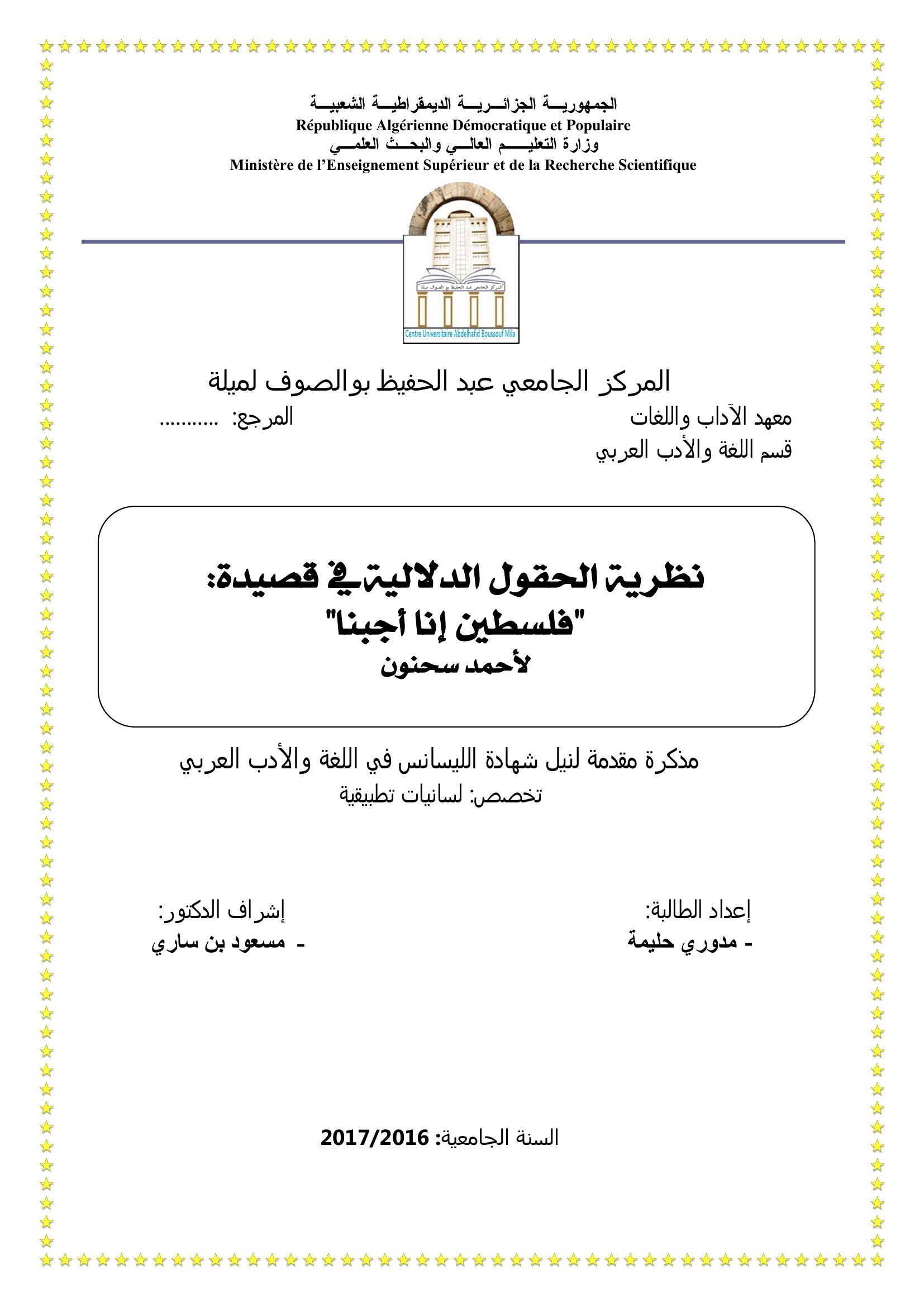 مدوري حليمة & بن ساري مسعود(مشرفا) (2017). نظرية الحقول الدلالية في قصيدة فلسطين إنا أجبنا لأحمد سحنون.