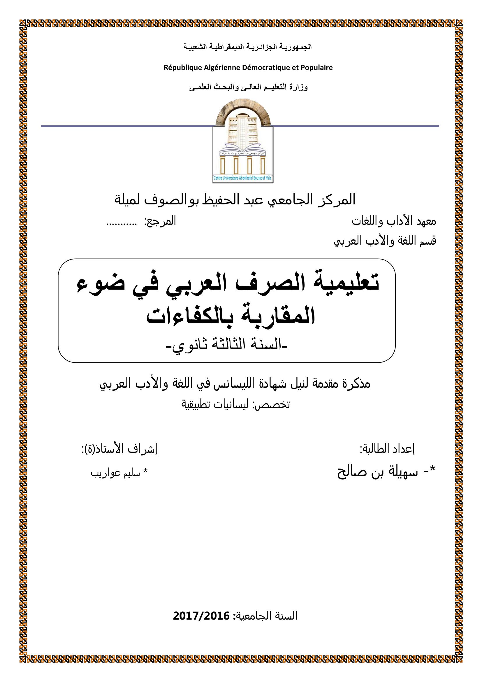 بن صالح سهيلة & عواريب سليم (مشرفا) (2017). تعليمية الصرف العربي في ضوء المقاربة بالكفاءات السنة الثالثة ثانوي.