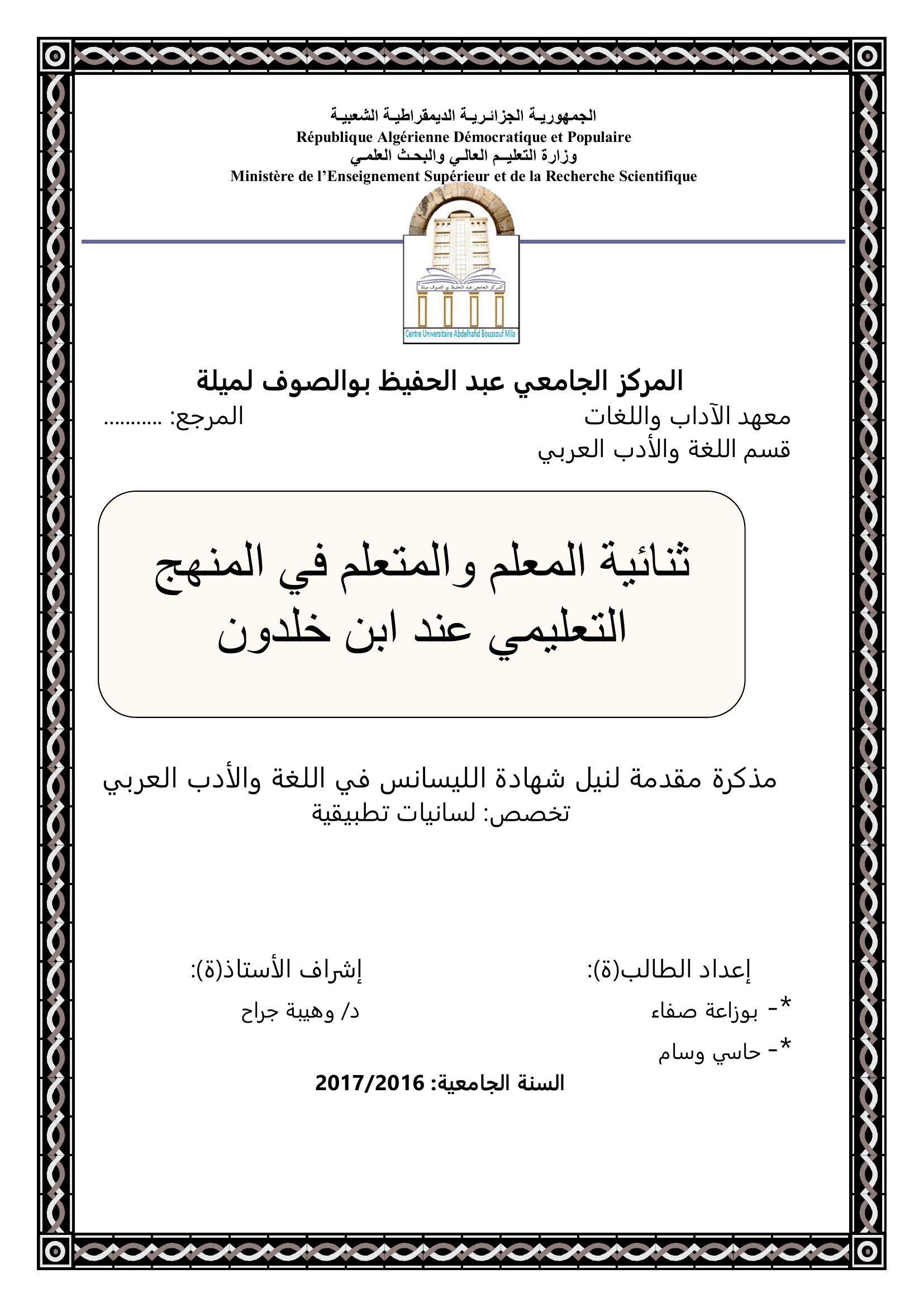 بوزاعة صفاء et al. (2017). ثنائية المعلم والمتعلم في المنهج التعليمي عند ابن خلدون.