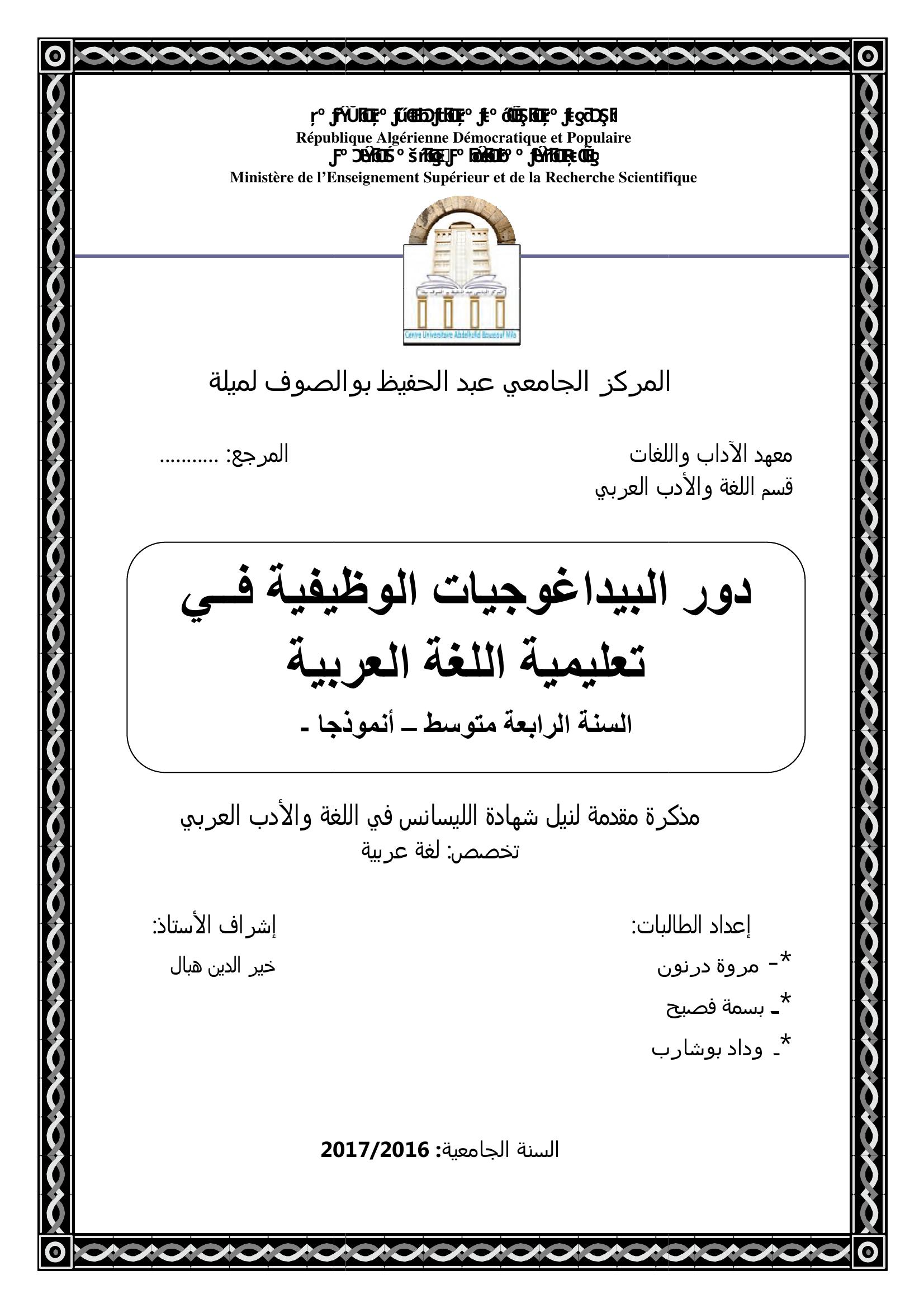 درنون مروة & هبال خير الدين (مشرفا) (2017). دور البيداغوجيات الوظيفية في تعليمية اللغة العربية السنة الرابعة متوسط أنموذجا.