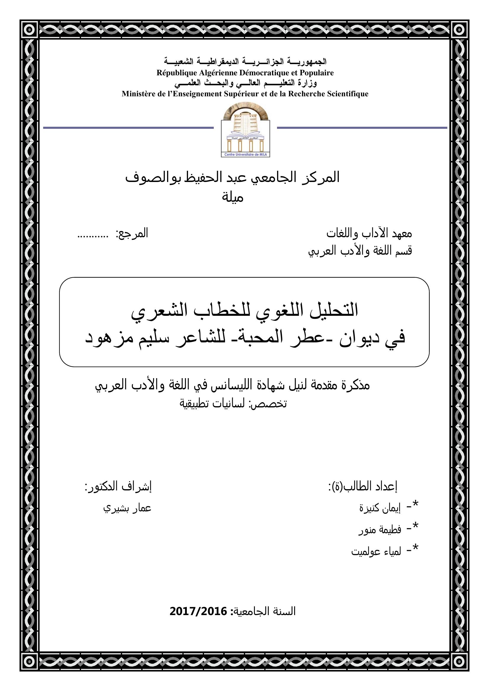 كنيزة إيمان et al. (2017). التحليل اللغوي للخطاب الشعري في ديوان عطر المحبة للشاعر سليم مزهود.
