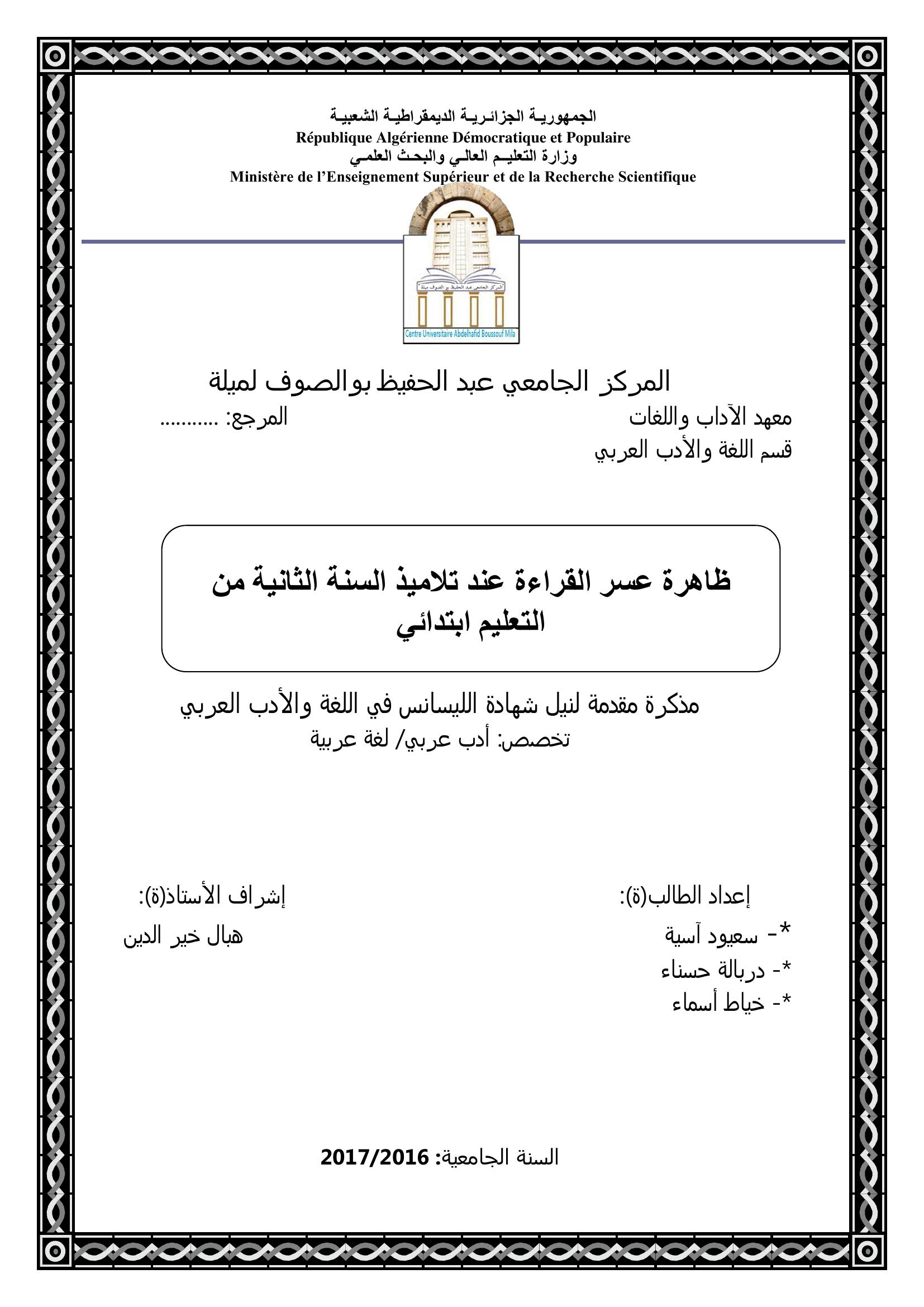 سعيود آسية et al. (2017). ظاهرة عسر القراءة عند تلاميذ السنة الثانية من التعليم الإبتدائي.