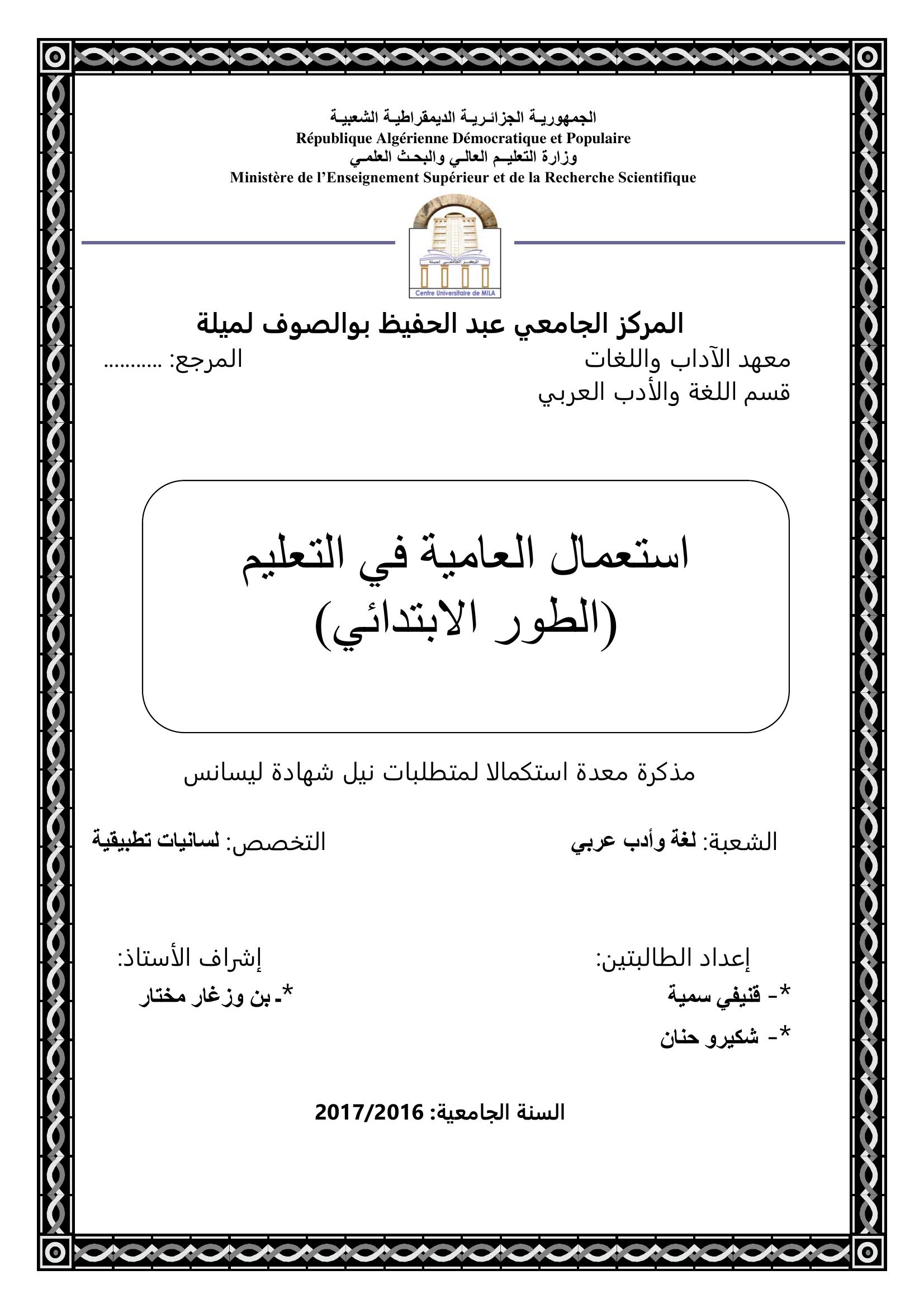 قنيفي سمية et al. (2017). إستعمال العامية في التعليم (الطور الإبتدائي ).