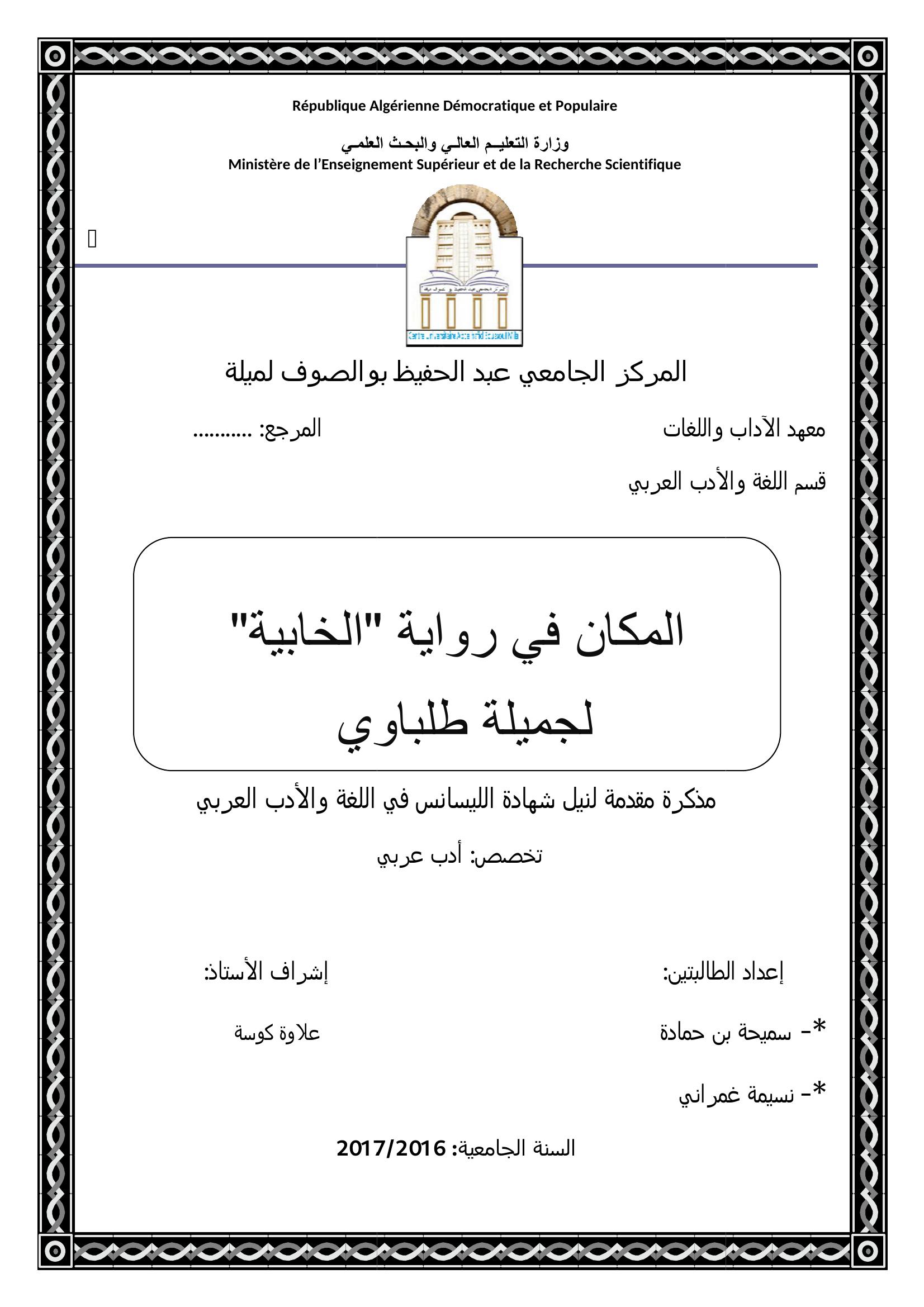 بن حمادة سميحة et al. (2017). المكان في رواية الخابية لجميلة طلباوي.