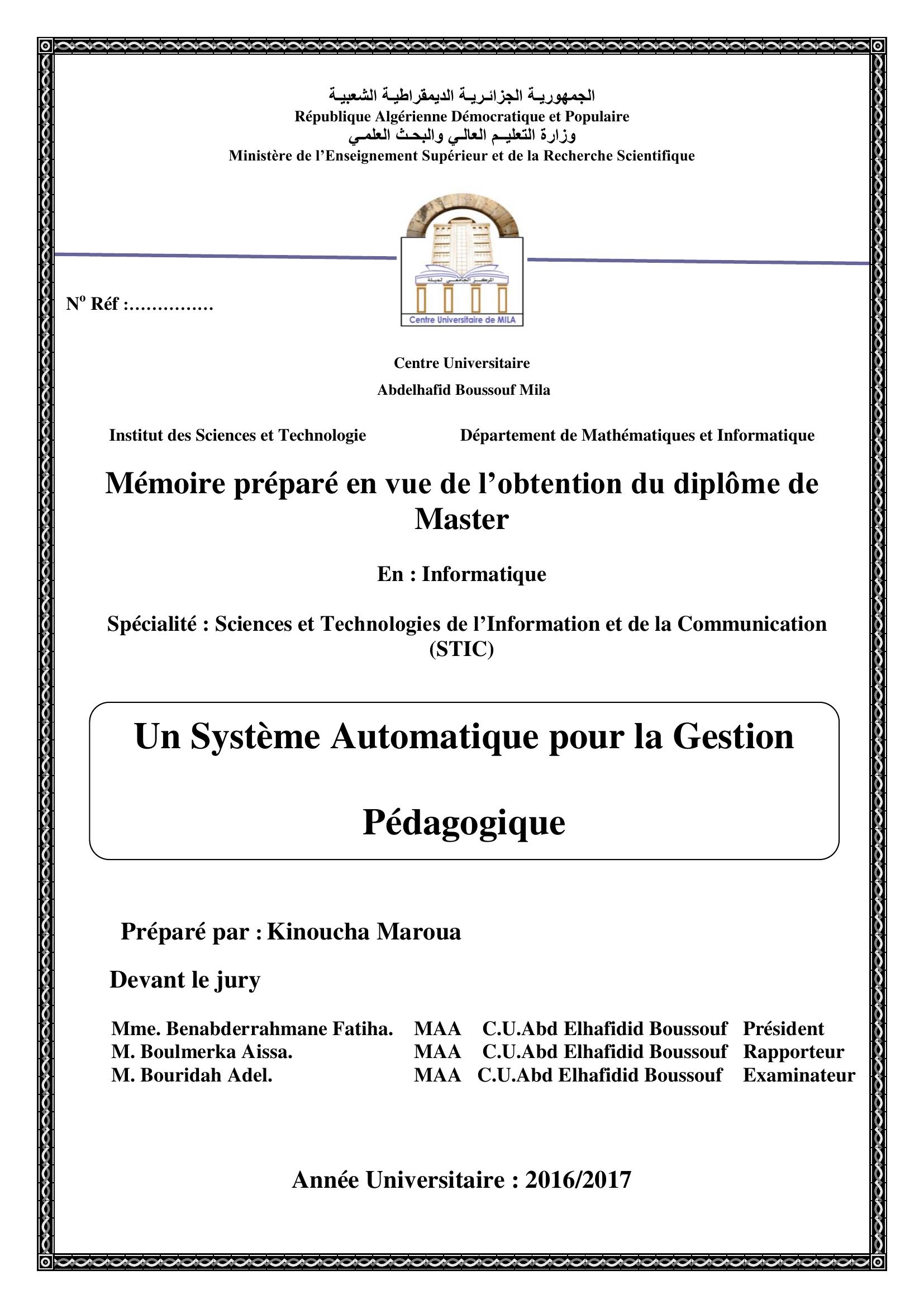 Kinoucha maroua & Benabderrahmane Fatiha Président, B. (2017). Un systémes automatique pour la gestion pédagogique.
