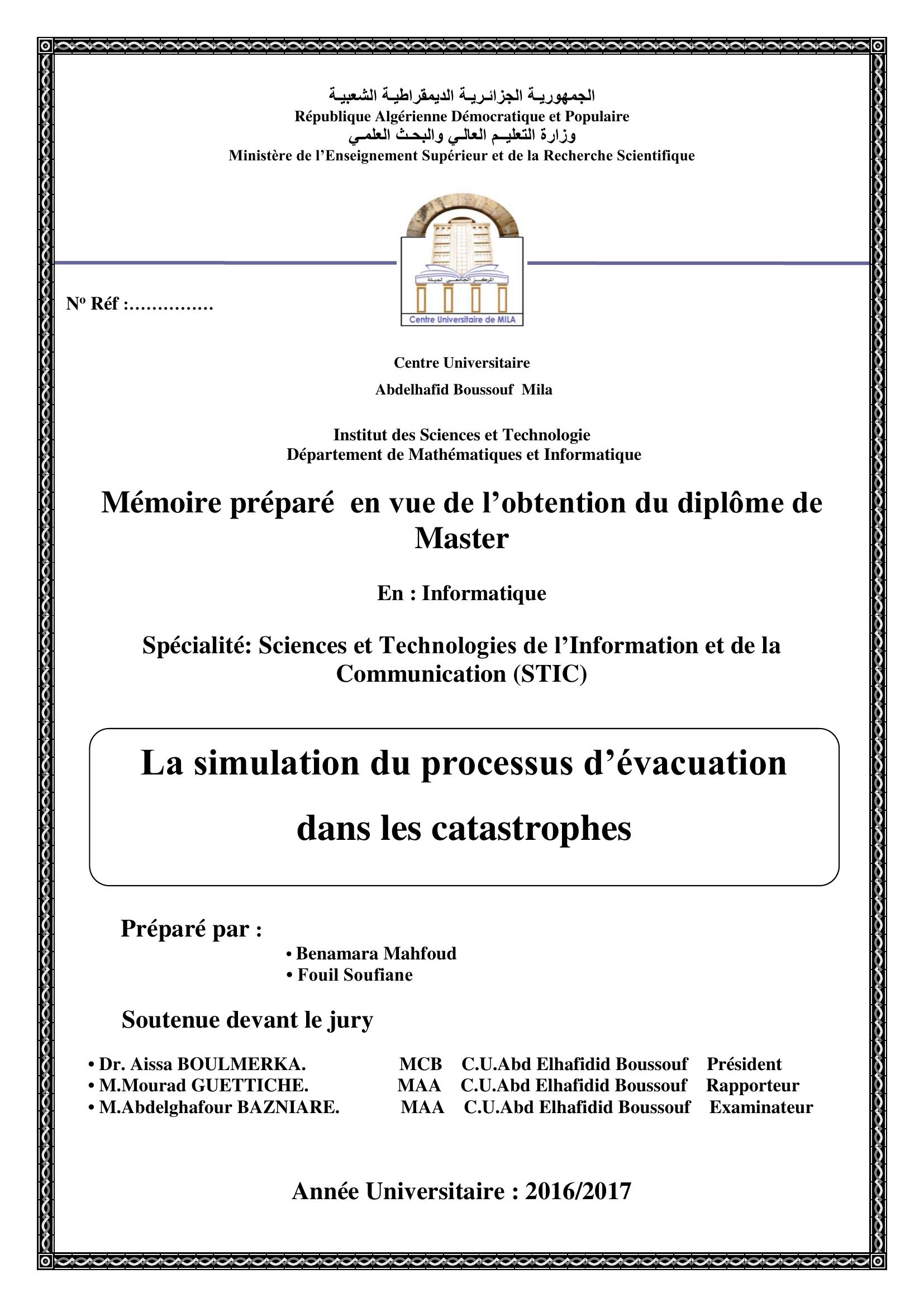 Benamara mahfoud & Aissa BOULMERKA Président, M. (2017). La simulation du processus d'évacuation dans les catastrophes.
