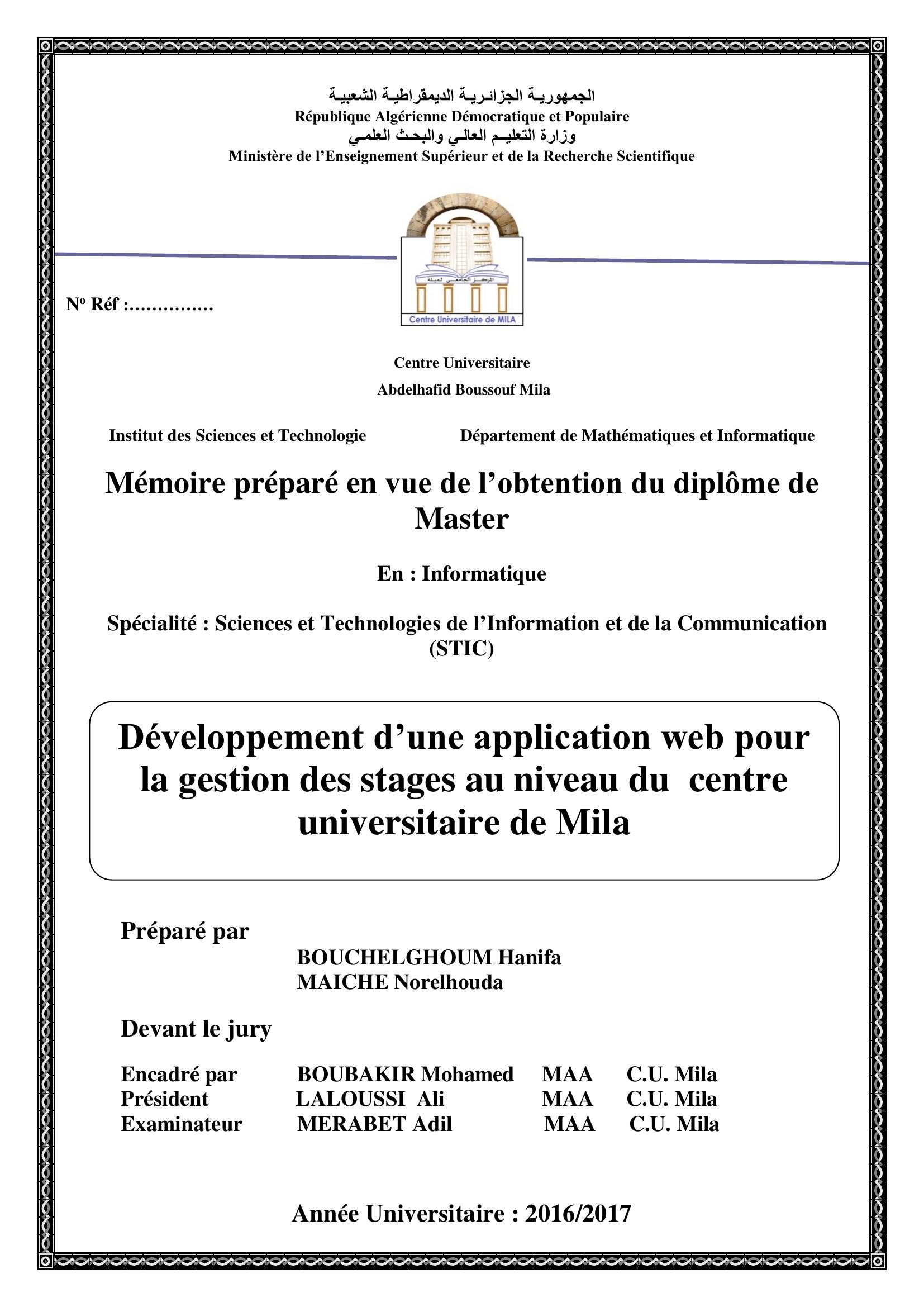 Maiche norelhouda & BOUBAKIR Mohamed encadreur, L. (2017). Développement d'une application web pour la gestion des stages au niveau du centre universitaire de mila.