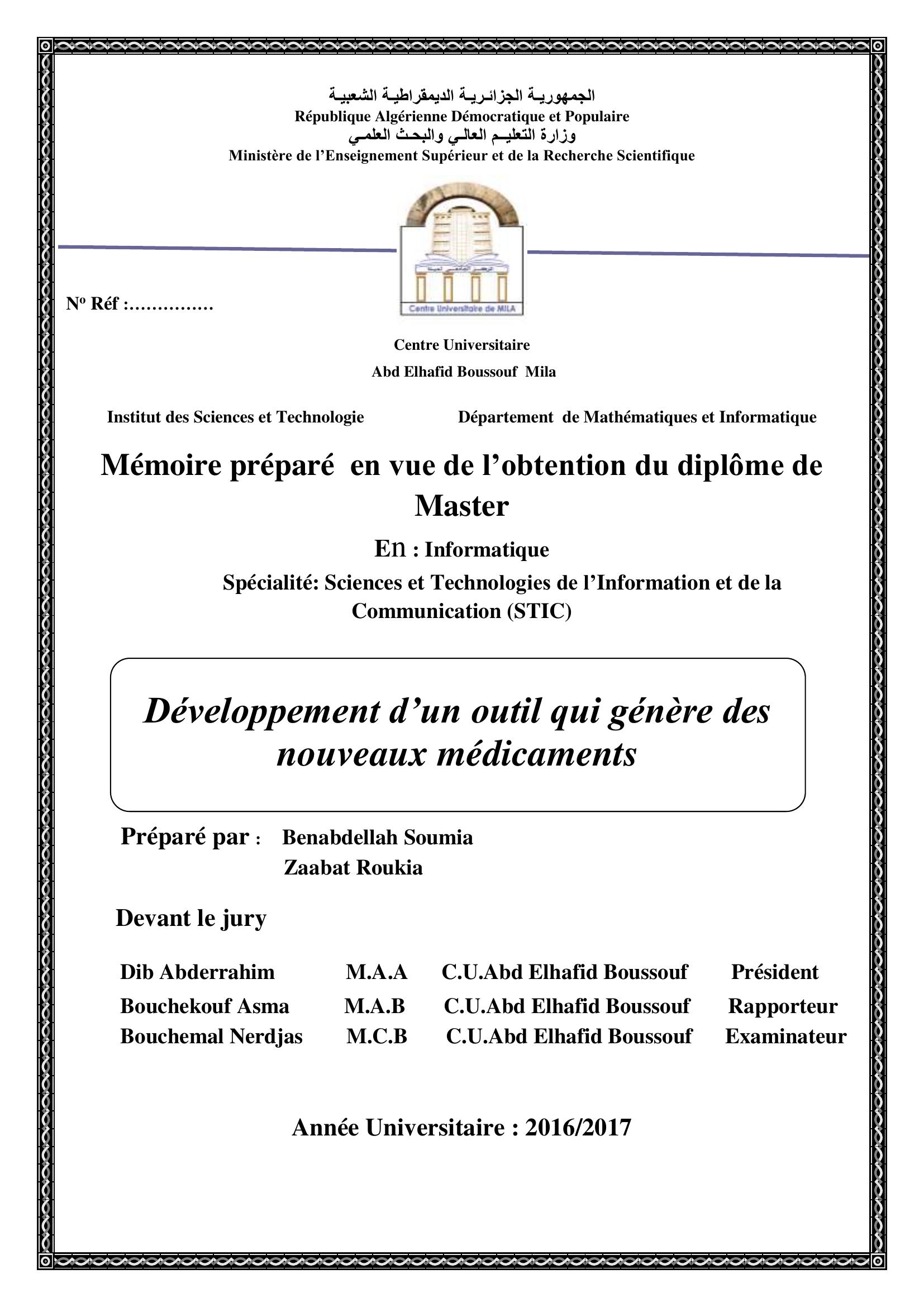 Zaabat roukia & Dib Abderrahim Président, B. (2017). Développement d'un outil qui génére des nouveaux médicaments.