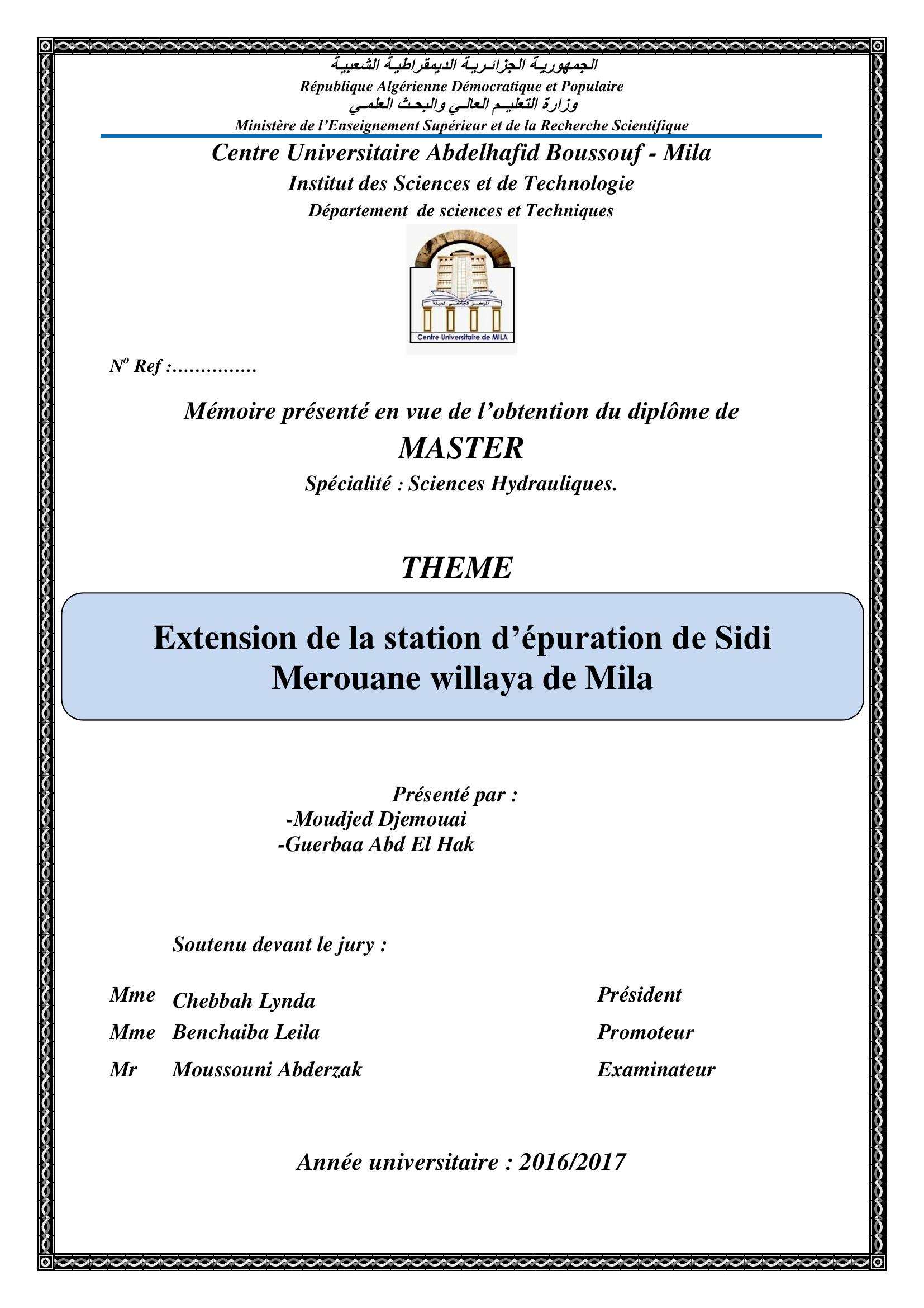 Moudjed djemouai & Chebbah Lynda Président, B. (2017). Extention de la station d'épuration de sidi merouane wilaya de mila.