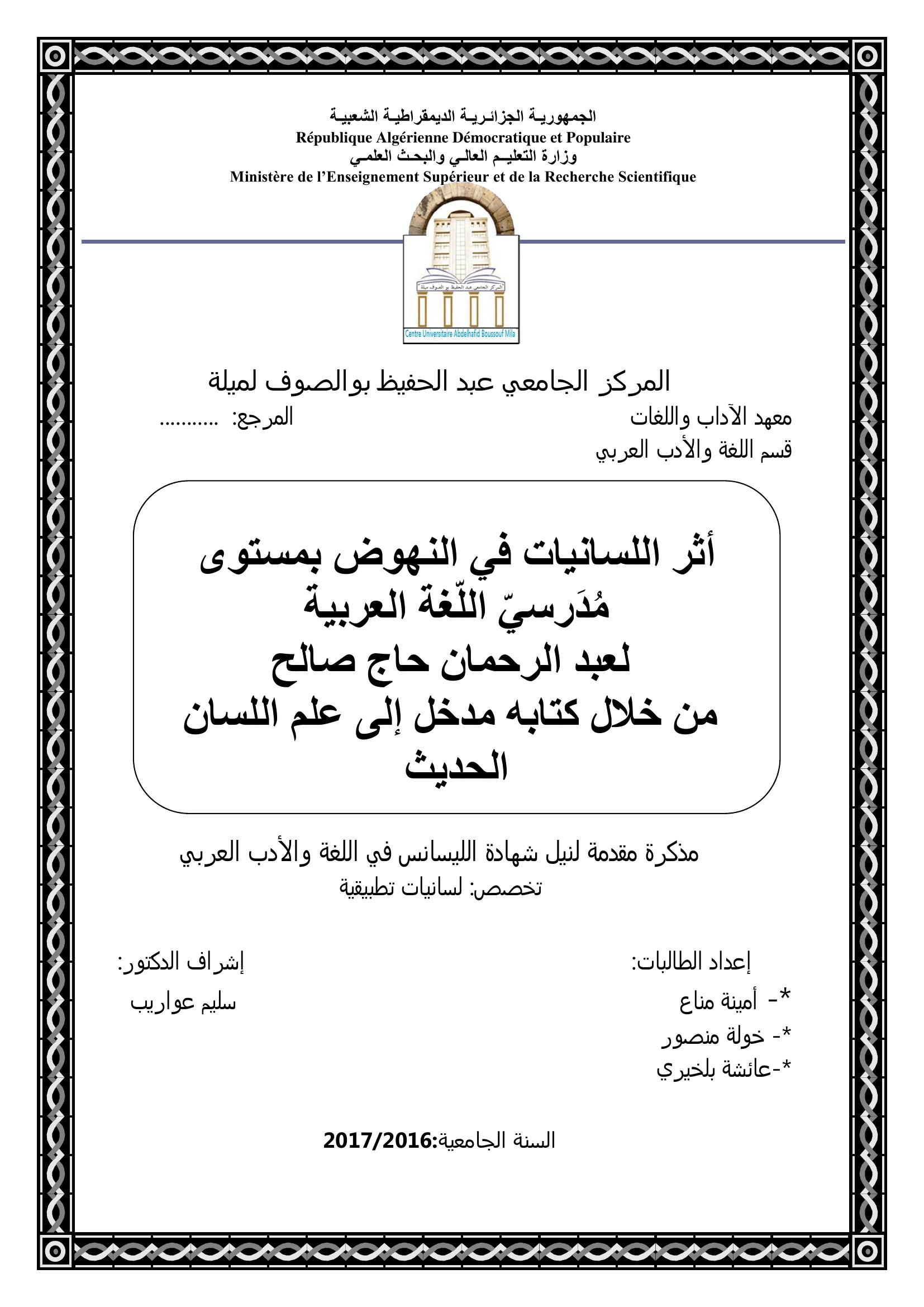 مناع أمينة et al. (2017). أثر اللسانيات في النهوض بمستوى مدرسي اللغة العربية لعبد الرحمان حاج صالح من خلال كتابه مدخل إلى علم اللسان الحديث.