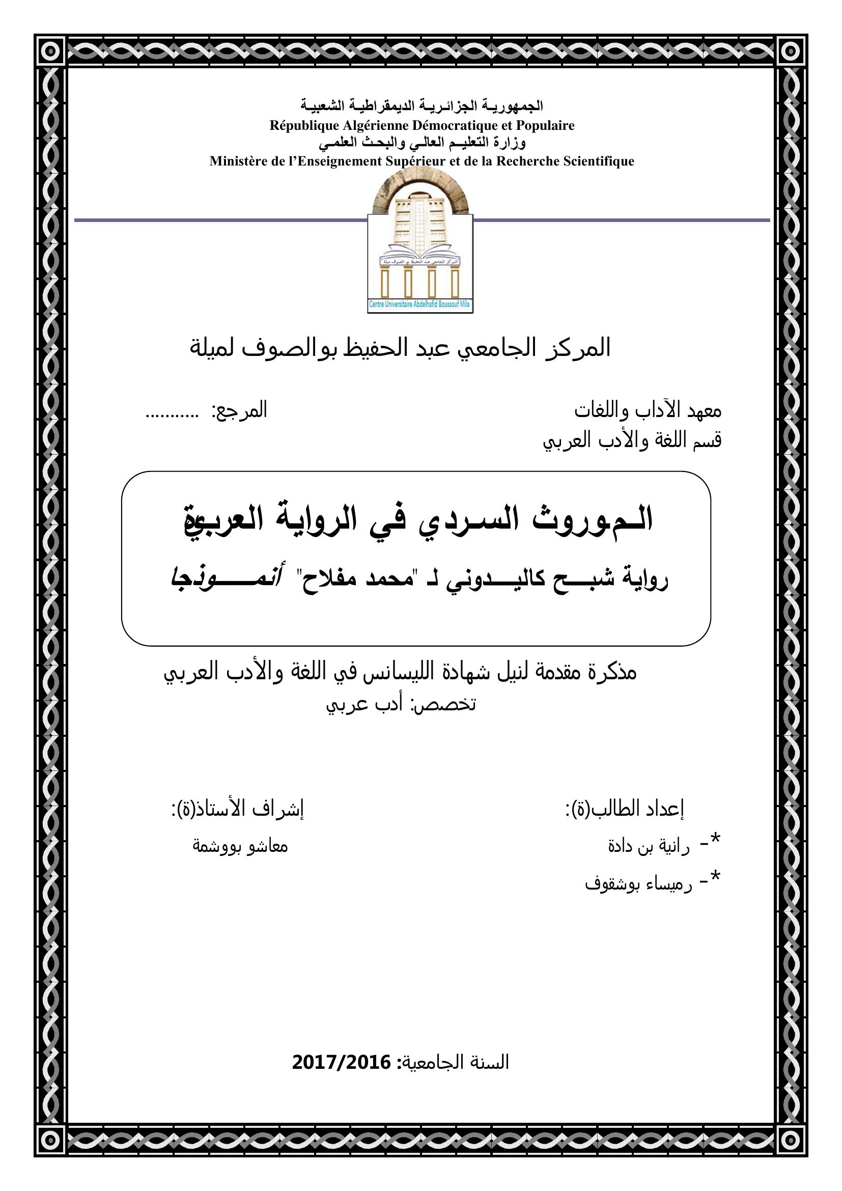 بن دادة رانية et al. (2017). الموروث السردي في الرواية العربية رواية شبح كاليدوني لـ محمد مفلاح أنموذجا.