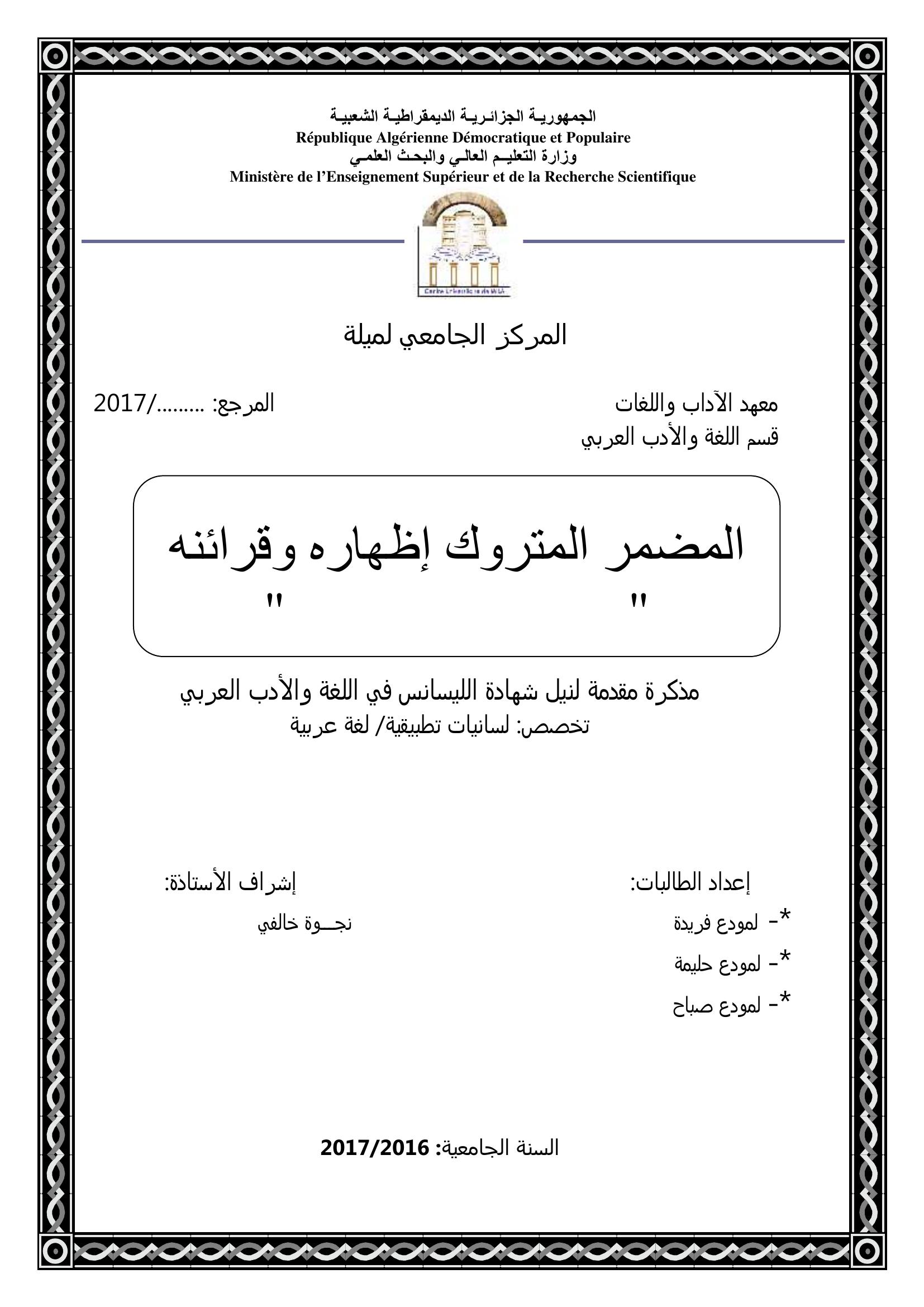 لمودع فريدة et al. (2017). المضمر المتروك إظهاره وقرائنه سورة البقرة أنموذج.