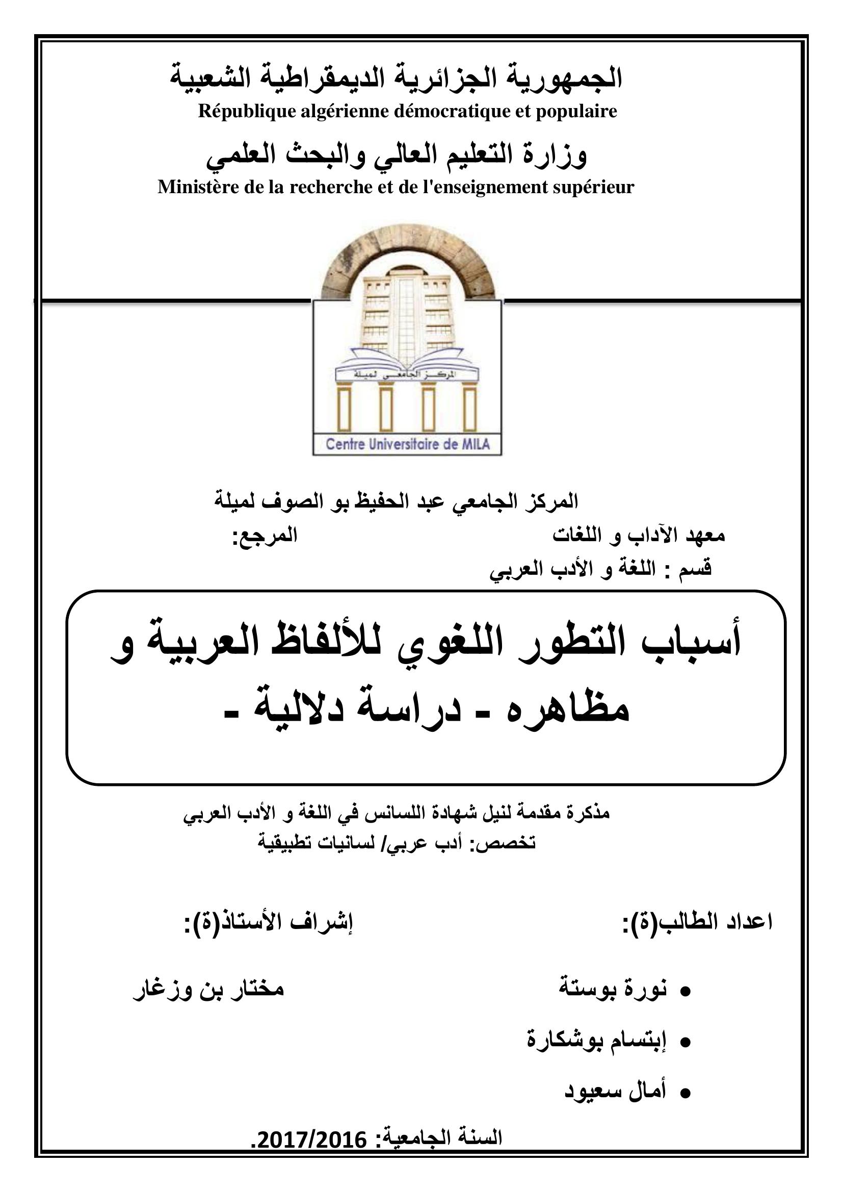 سعيود أمال et al. (2017). أسباب التطور اللغوي للألفاظ العربية ومظاهره دراسة دلالية.