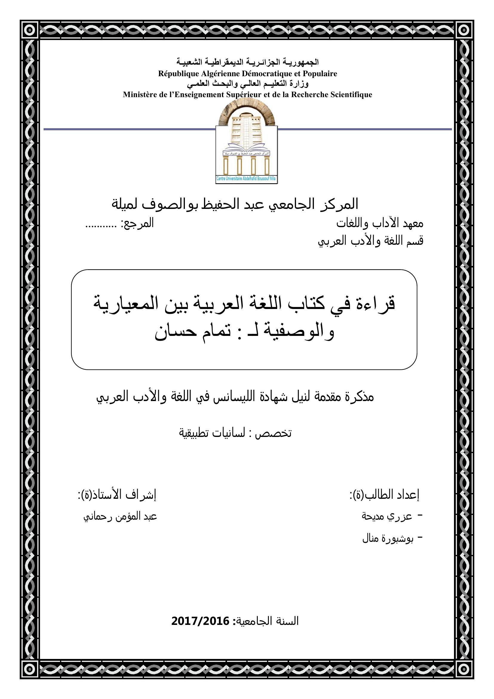 عزري مديحة et al. (2017). قراءة في كتاب اللغة العربية بين المعيارية والوصفية لــ تمام حسان.