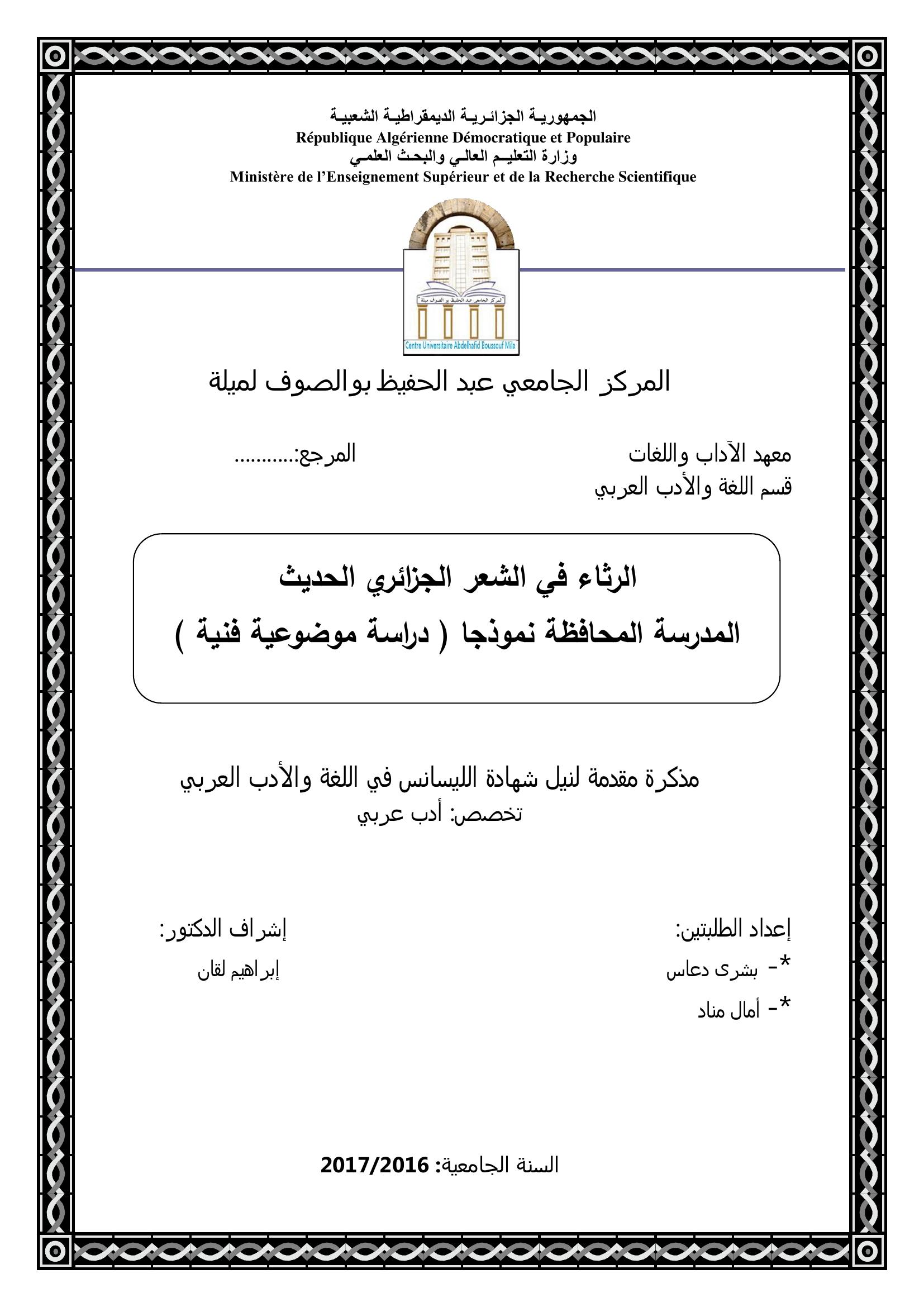 دعاس بشرى et al. (2017). الرثاء في الشعر الجزائري الحديث المدرسة المحافظة نموذجا (دراسة موضوعية فنية ).