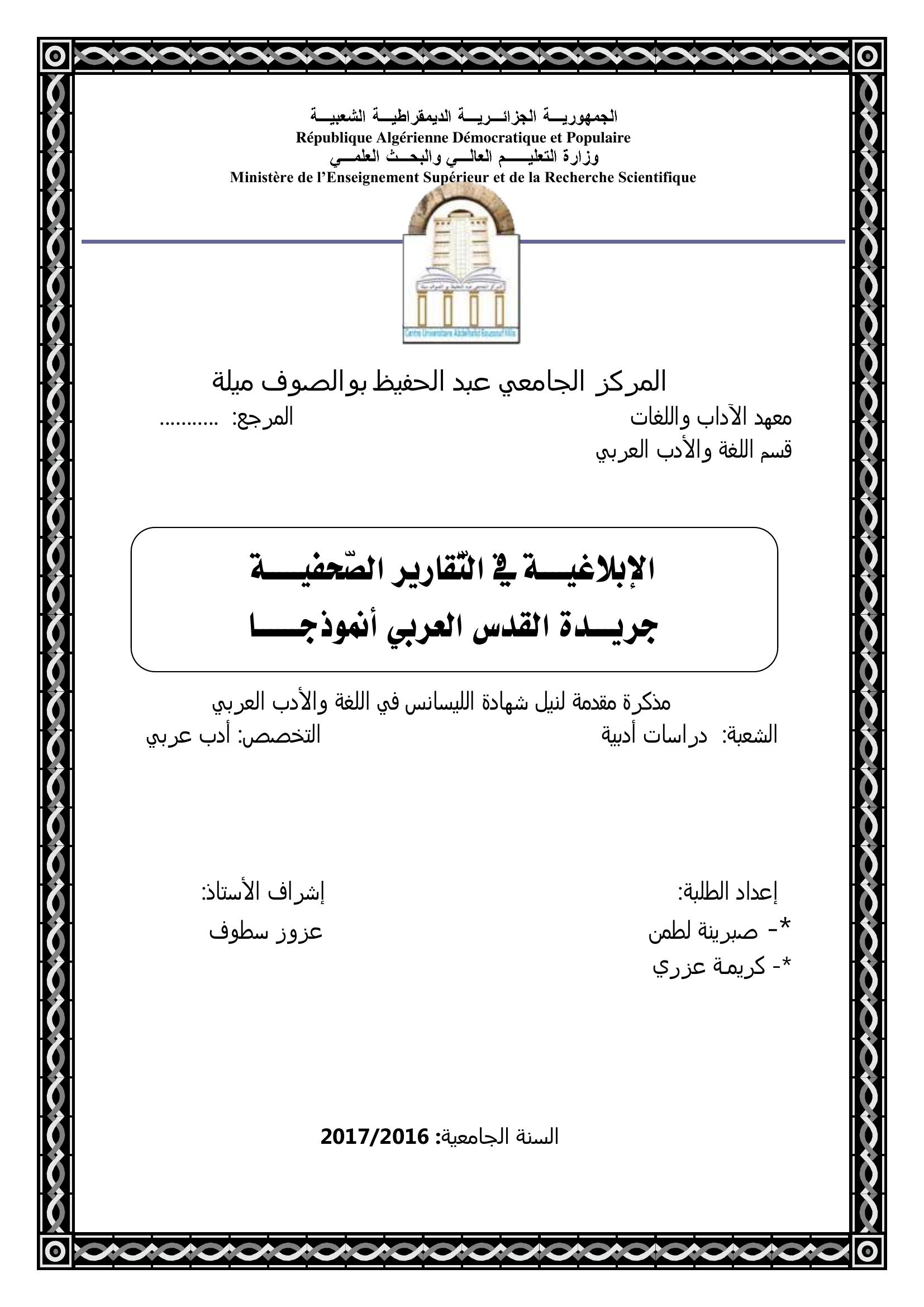 لطمن صبرينة et al. (2017). الإبلاغية في التقارير الصحفية جريدة القدس العربي أنموذجا.
