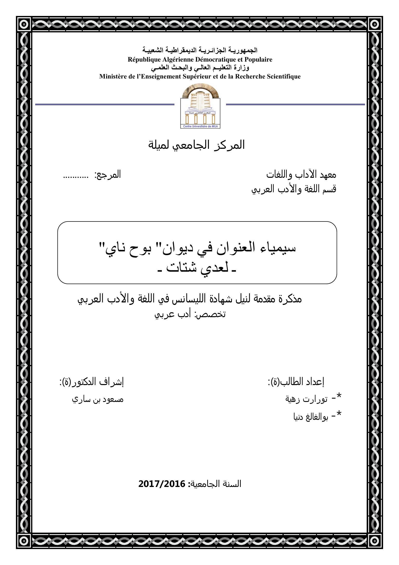 تورارت زهية et al. (2017). سيمياء العنوان في ديوان بوح ناي لعدي شتات.