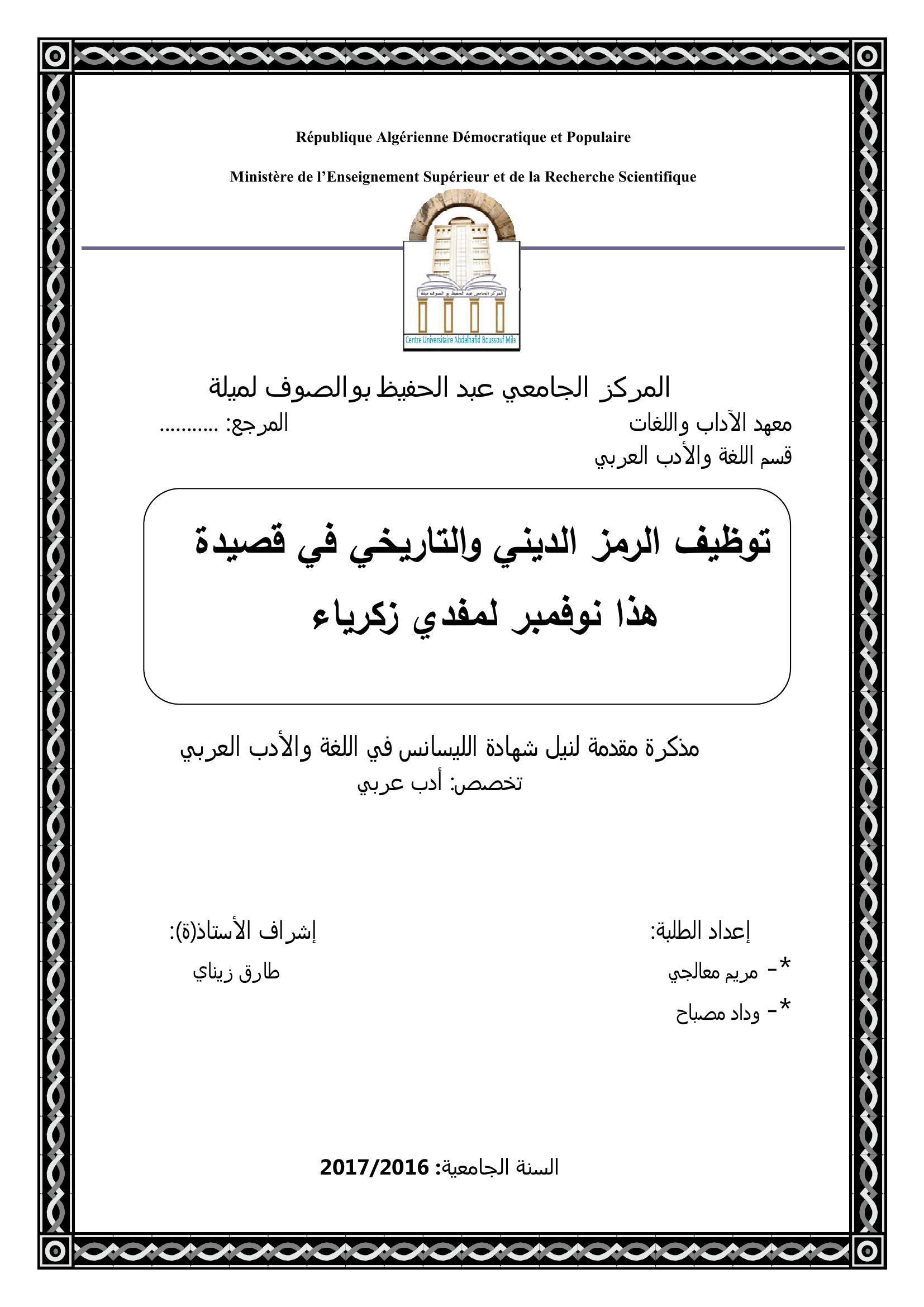 معالجي مريم et al. (2017). توظيف الرمز الديني والتاريخي في قصيدة هذا نوفمبر لمفدي زكرياء.
