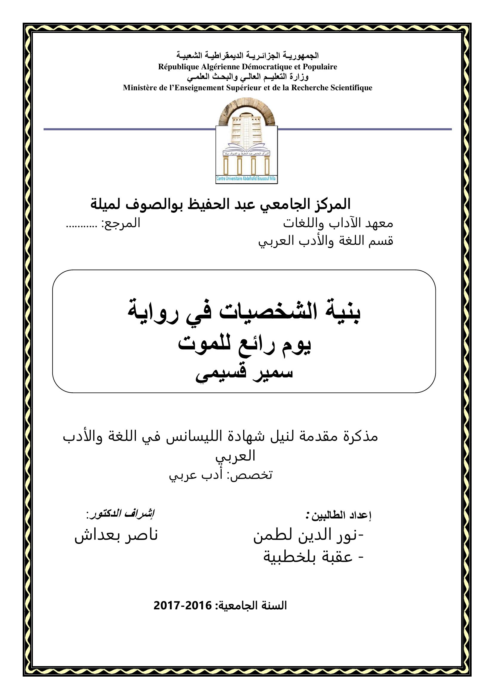 لطمن نور الدين & بعداش ناصر (مشرفا) (2017). بنية الشخصيات في رواية يوم رائع للموت لسمير قسيمي.