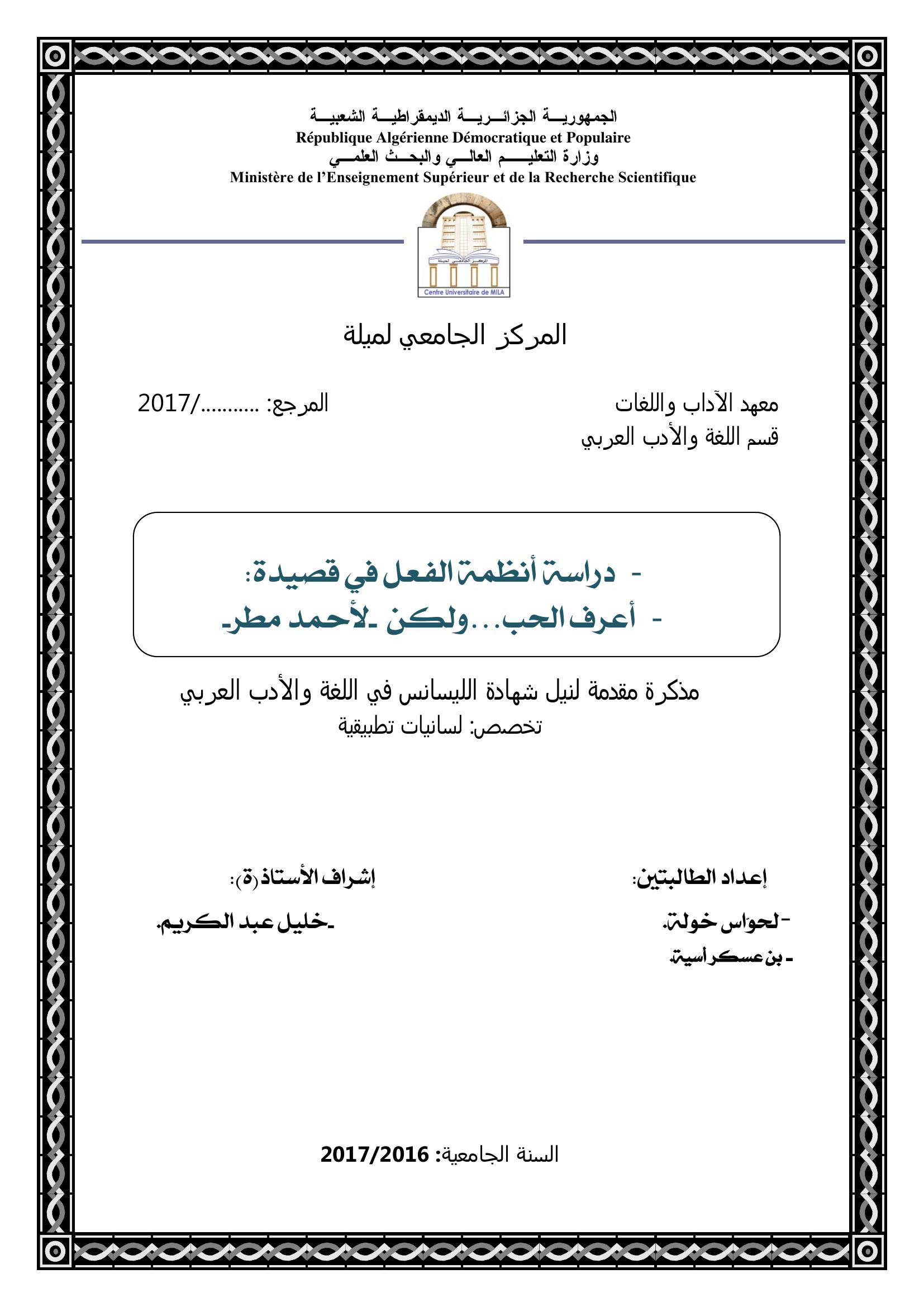 لحواس خولة & خليل عبد الكريم (مشرفا) (2017). دراسة أنظمة الفعل في قصيدة أعرف الحب ولكن لأحمد مطر.