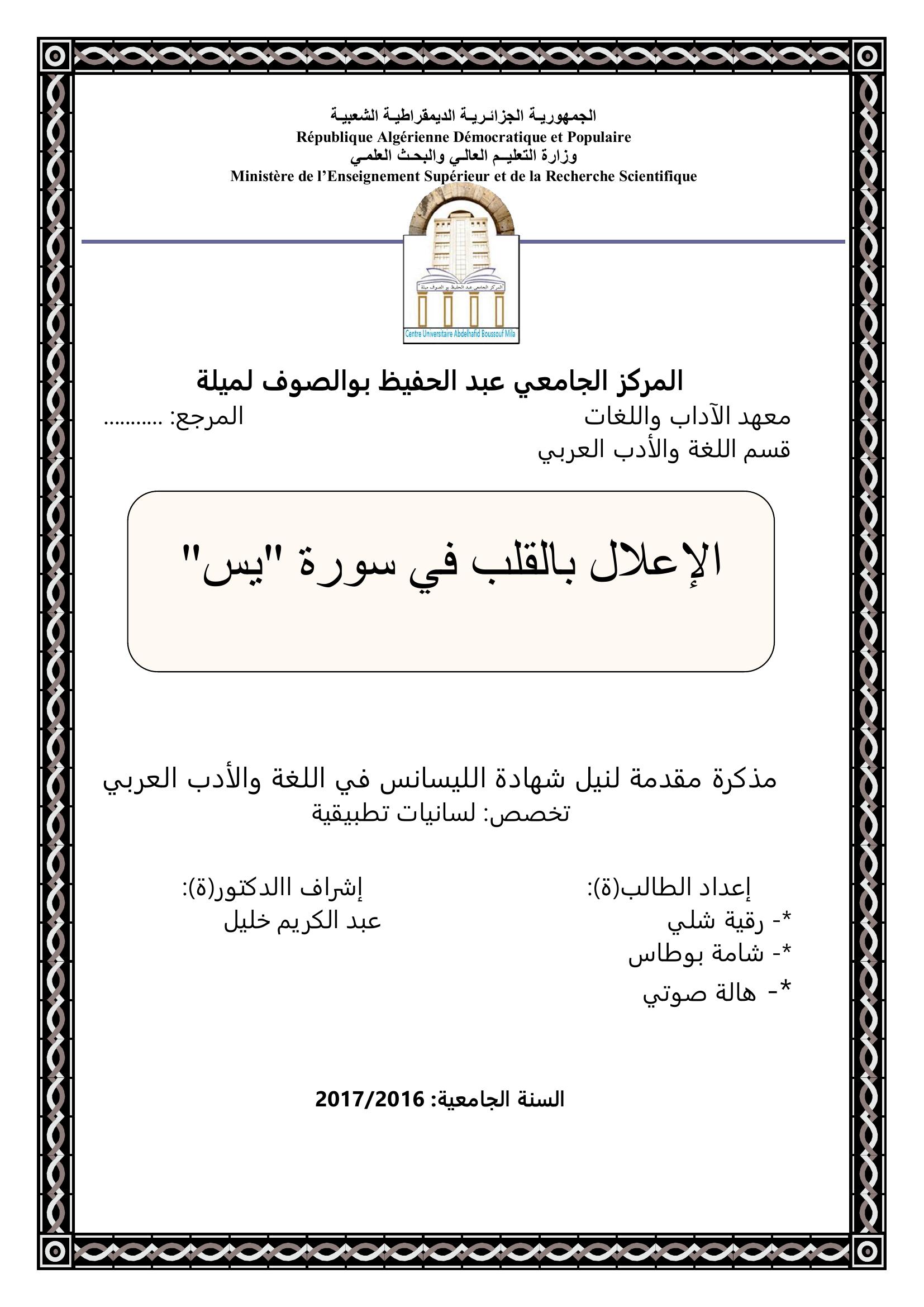 شلي رقية & خليل عبد الكريم (مشرفا) (2017). الإعلال بالقلب في سورة '' يس''.