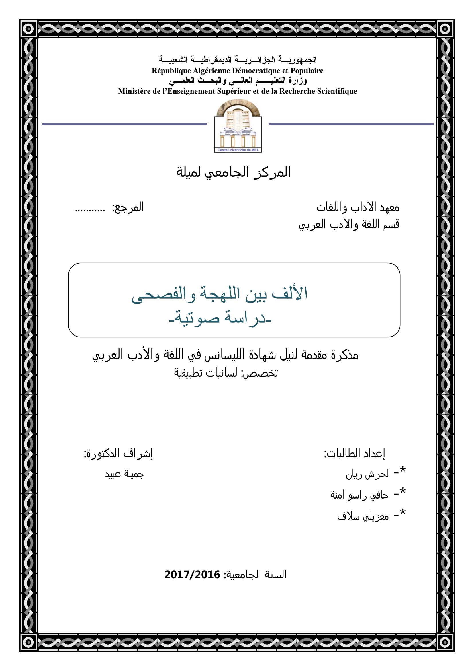 لحرش ريان & عبيد جميلة (مشرفا) (2017). الألف بين اللهجة والفصحى دراسة صوتية.