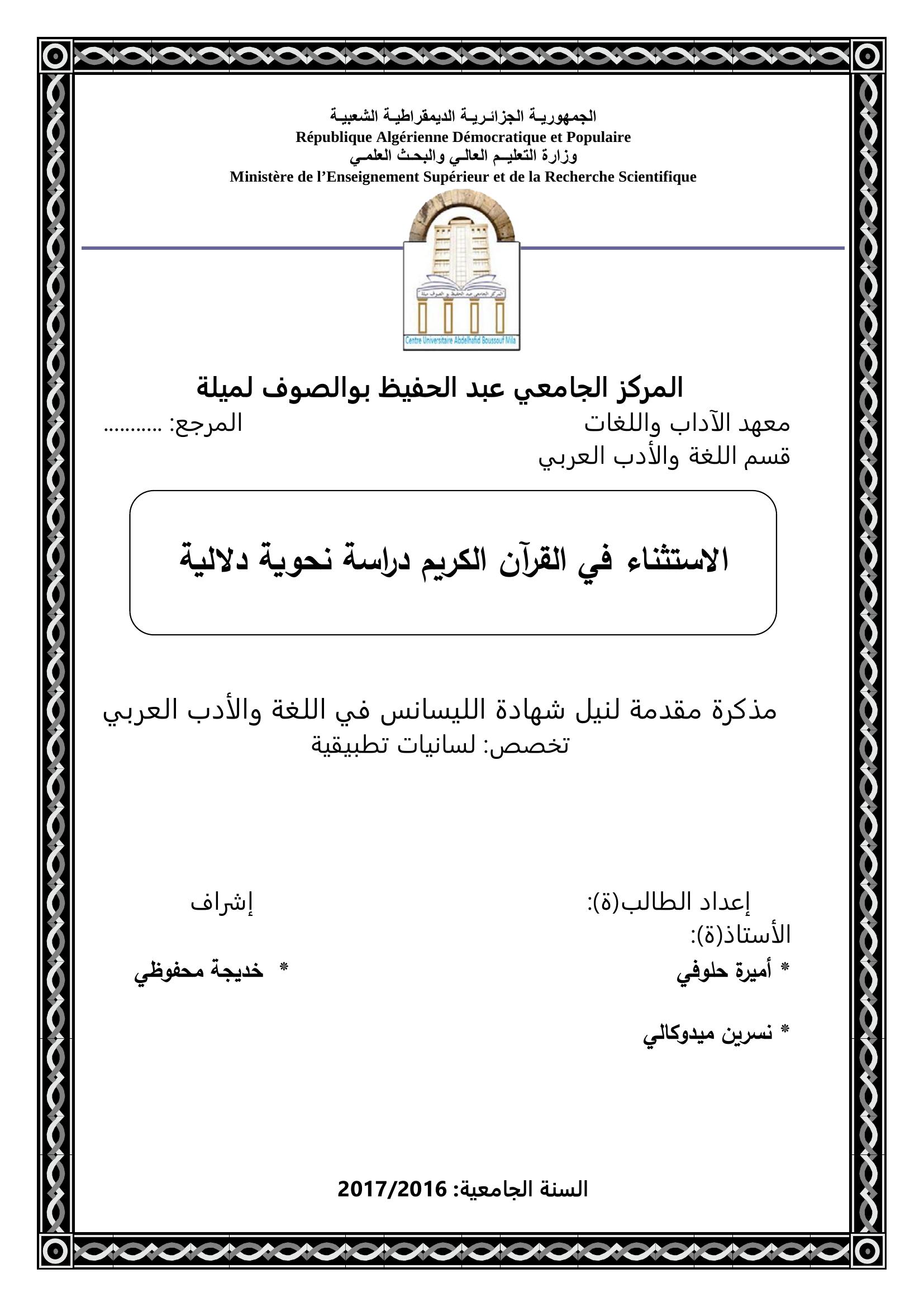 حلوفي أميرة & محفوظي خديجة (مشرفا) (2017). الإستثناء في القرآن الكريم دراسة نحوية دلالية.