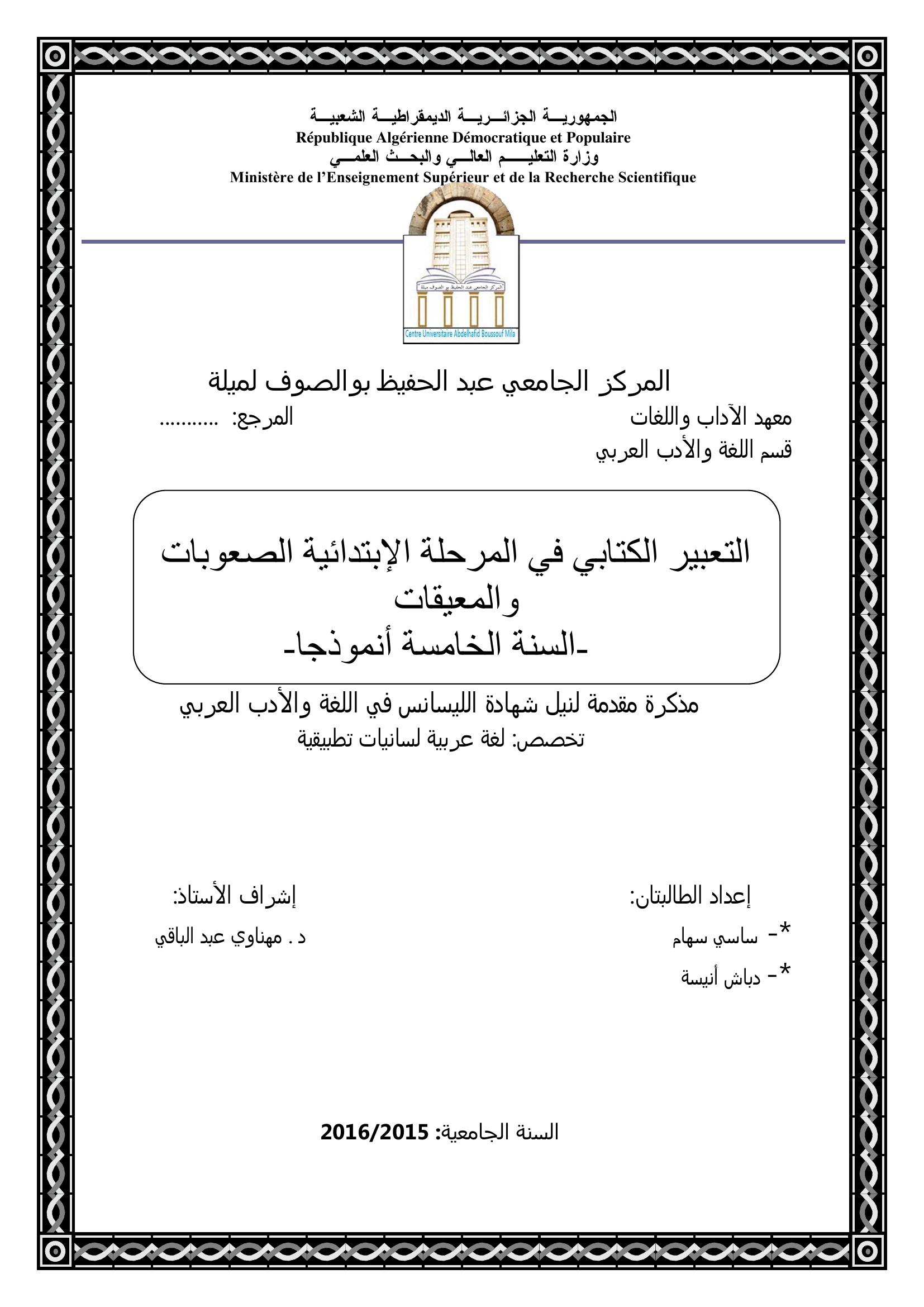 دباش أنيسة & مهناوي عبد الباقي(مشرفا) (2017). التعبير الكتابي في المرحلة الإبتدائية الصعوبات والمعيقات السنة الخامسة أنموذجا.