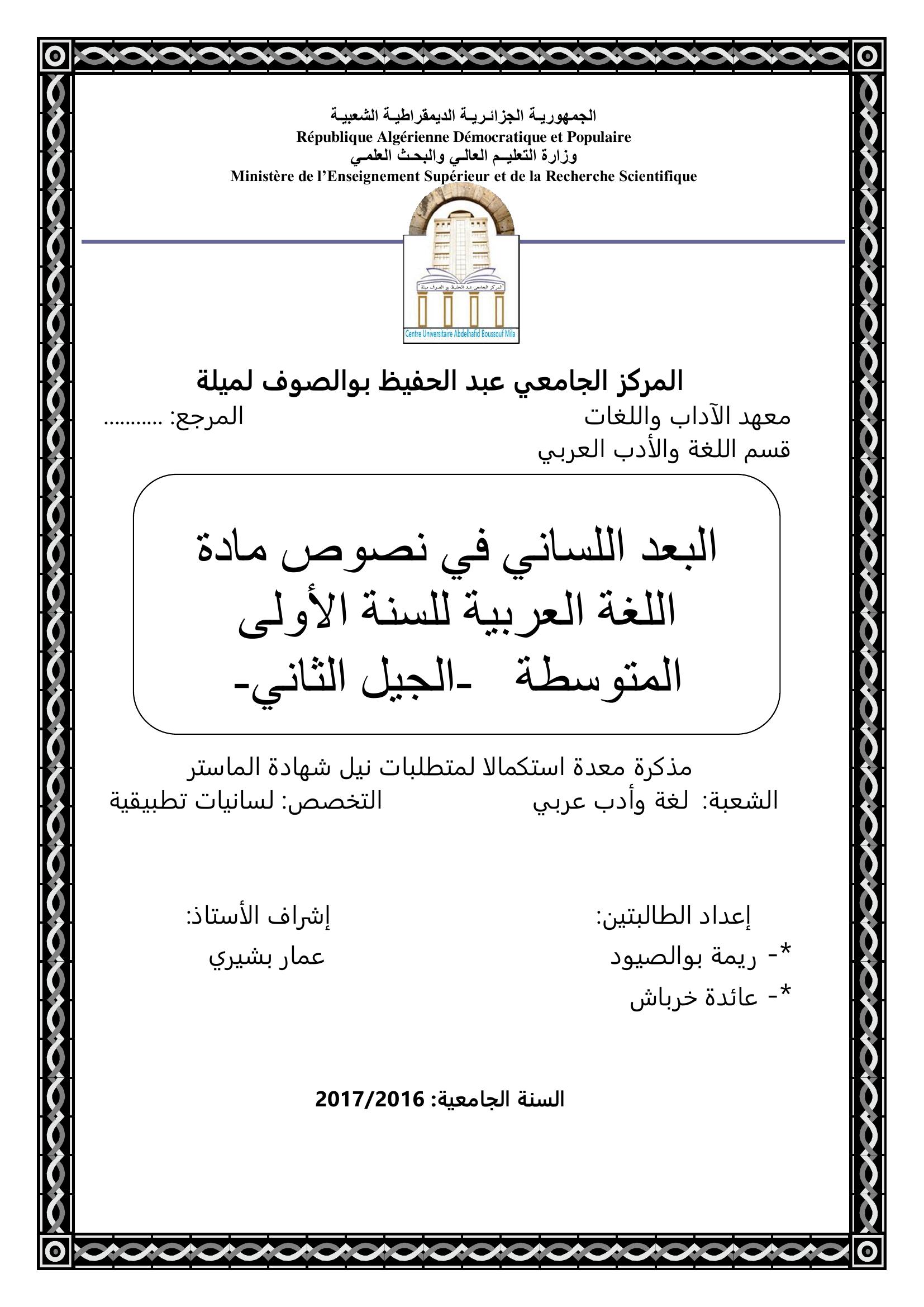 بوالصيود ريمة & بشيري عمار (مشرفا) (2017). البعد اللساني في نصوص مادة اللغة العربية للسنة الأولى متوسط الجيل الثاني.
