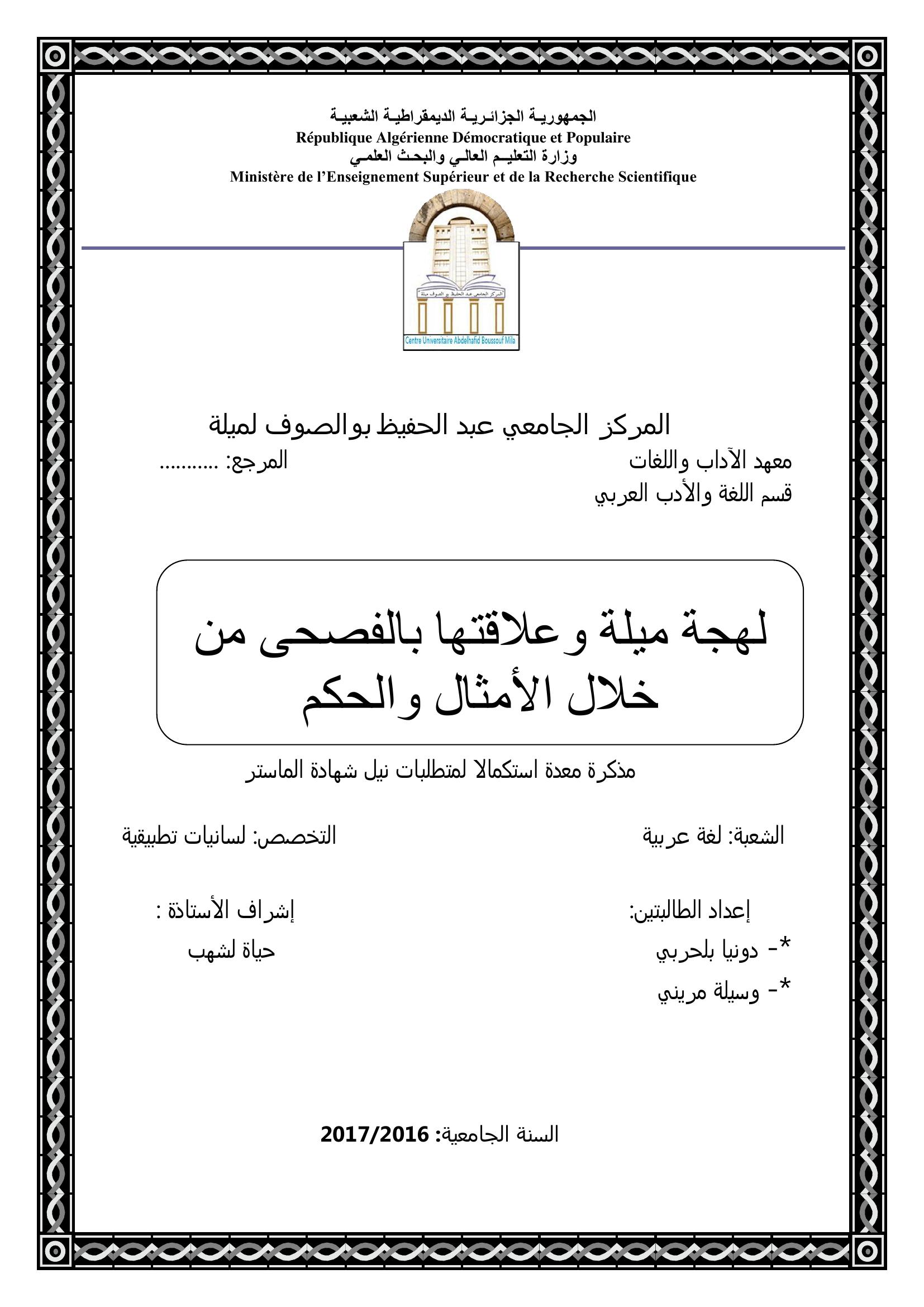 بلحربي دونيا et al. (2017). لهجة ميلة وعلاقتها بالفصحى من خلال الأمثال والحكم.
