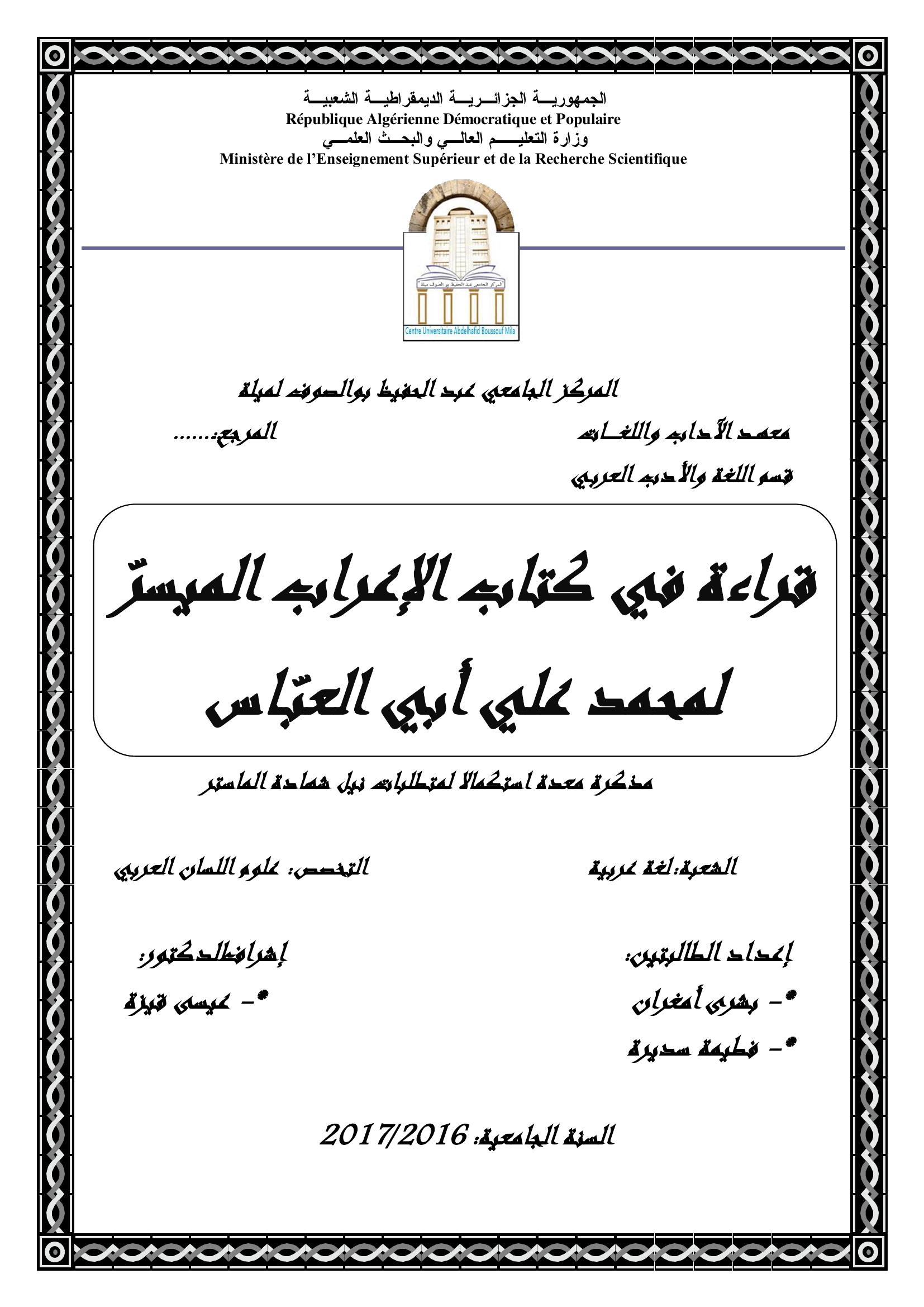 أمغران بشرى et al. (2017). قراءة في كتاب الإعراب الميسر لمحمد علي أبي العباس.