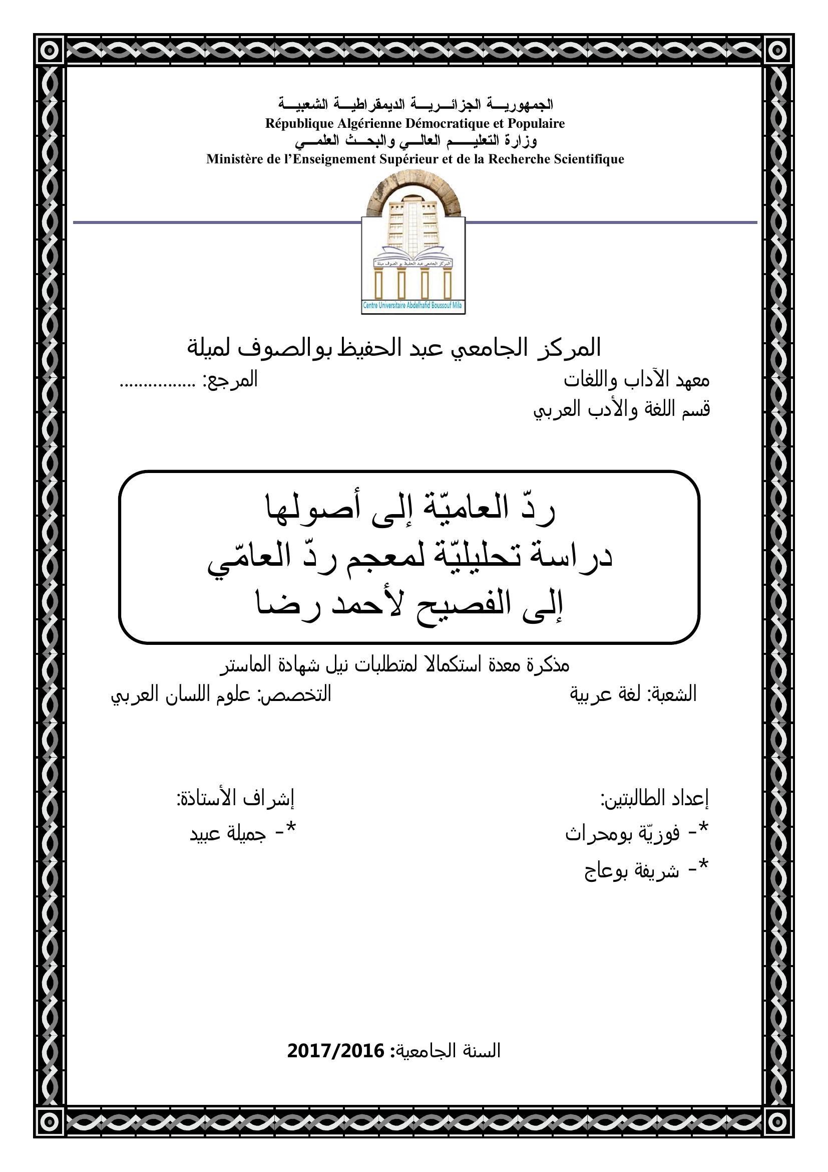 بومحراث فوزية et al. (2017). رد العامية إلى أصولها دراسة تحليلية لمعجم رد العامي إلى الفصيح لأحمد رضا.