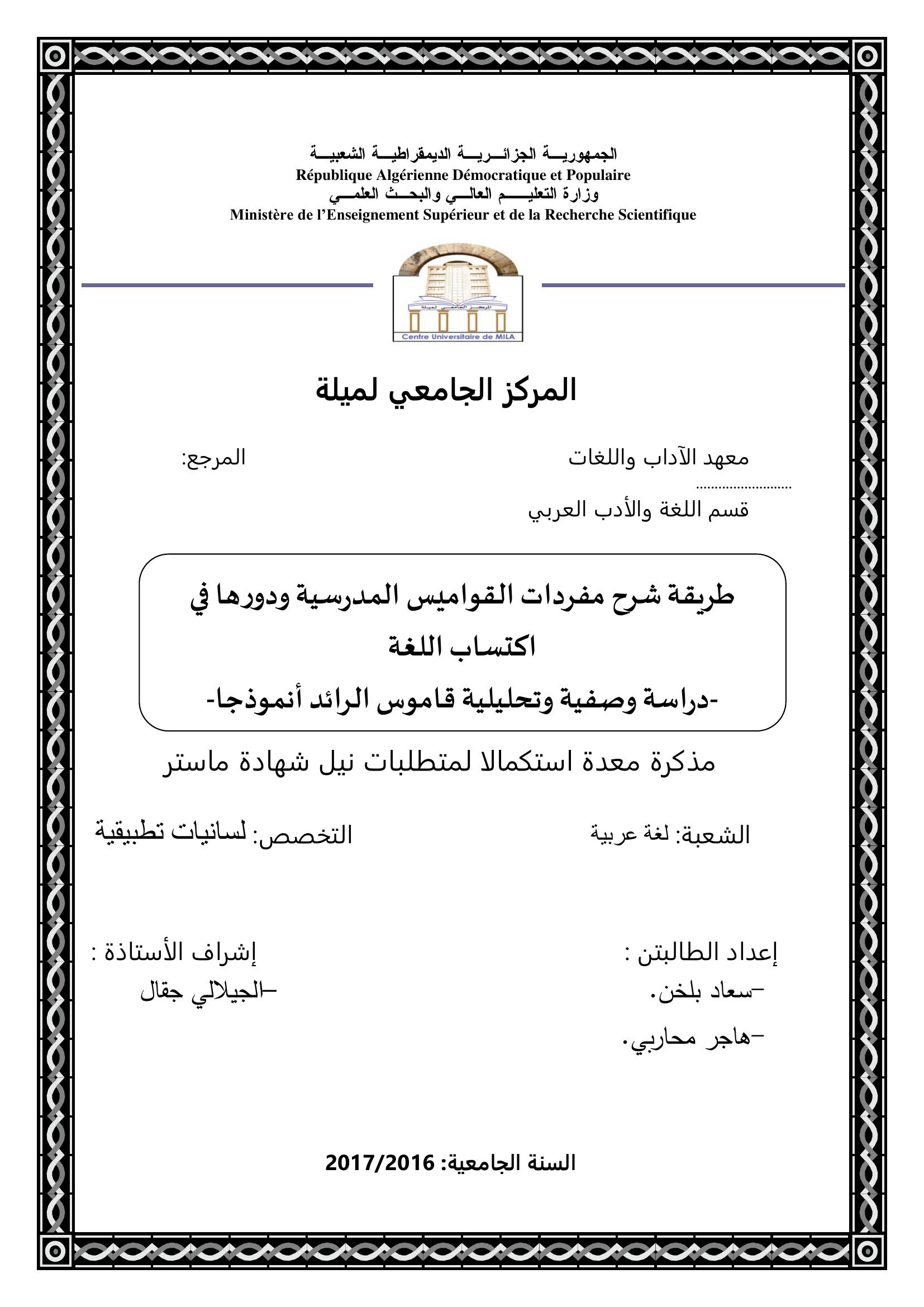 بلخن سعاد et al. (2017). طريقة شرح مفردات القواميس المدرسية ودورها في إكتساب اللغة دراسة وصفية وتحليلية قاموس الرائد أنموذجا.