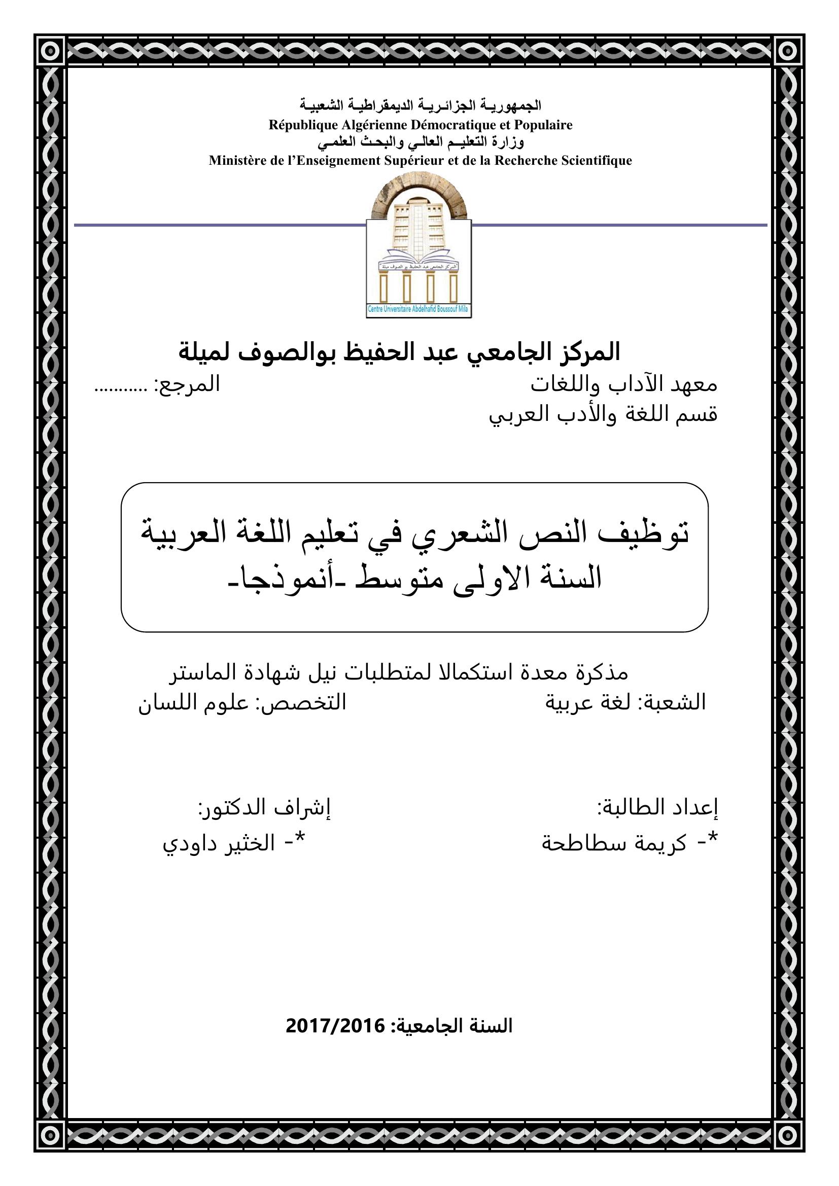 سطاطحة كريمة & الخثير داودي (مشرفا) (2017). توظيف النص الشعري في تعليم اللغة العربية السنة الأولى متوسط أنموذجا.